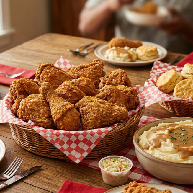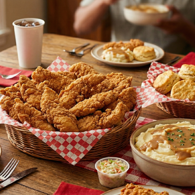 250 g. de pollo tender, 1 complemento, 1 biscuit, bebida (natural o salseado).