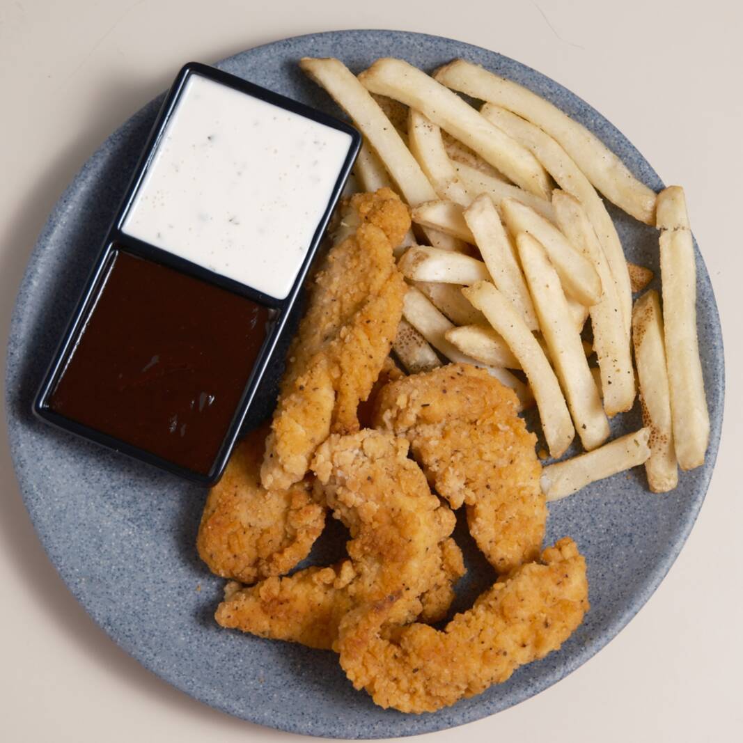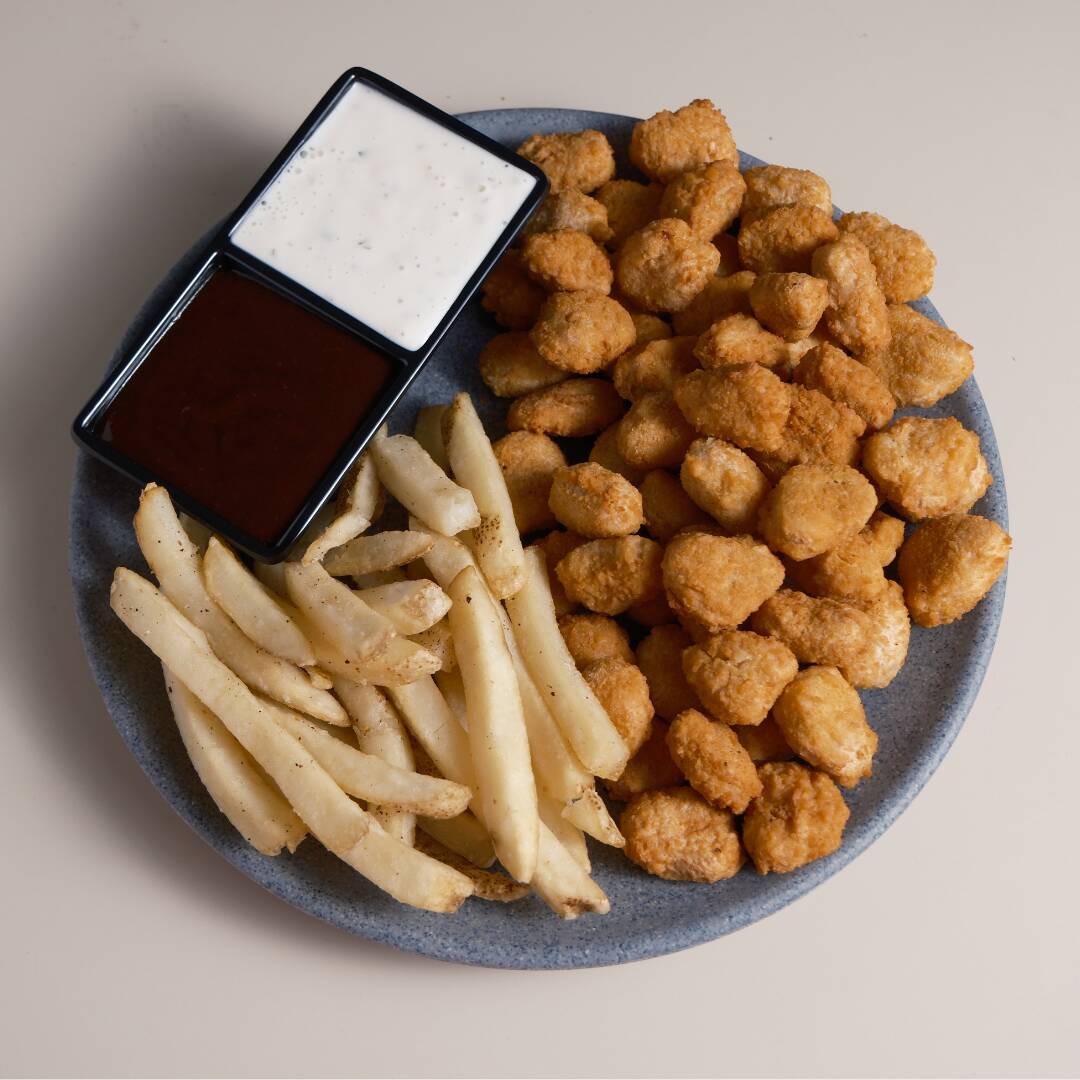 palomitas de pechuga de pollo fritas, acompañadas de papas fritas y 3 toppings de aderezo bbq/buffalo/ranch.