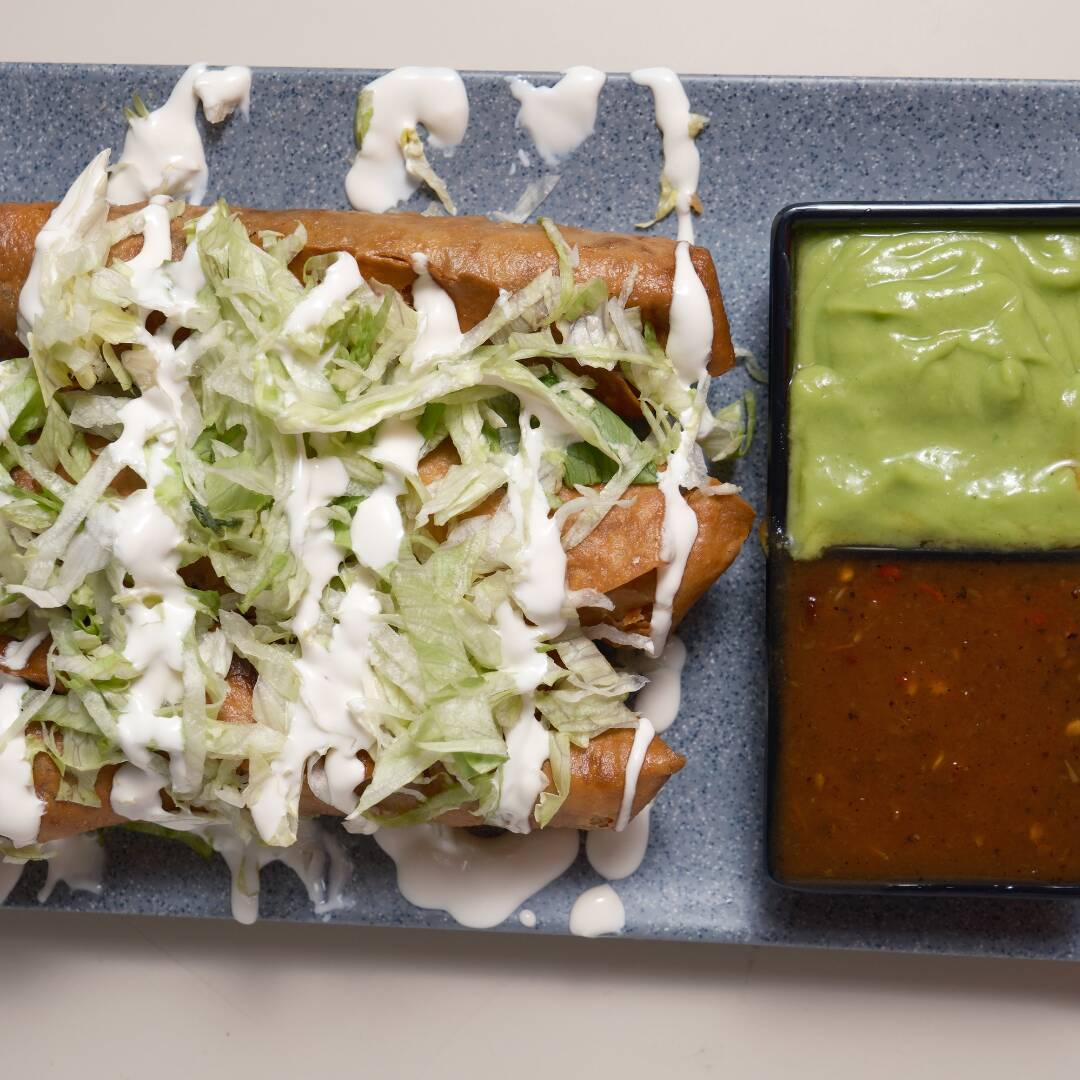 3 chimichangas con pollo deshuesado dentro, acompañada con verdura fresca, media crema, y toppings de salsa tatemada y guacamole