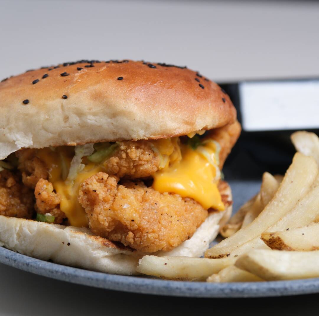 Hamburguesa de tenerds horneados y queso americano. acompañada de papas fritas y toppings de aderezo ranch y buffalo.