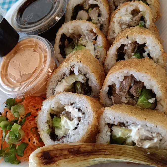 Por dentro carne de res, alga, Philadelphia, aguacate y pepino. Por fuera empanizado crujiente