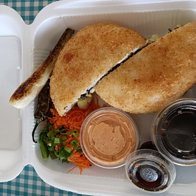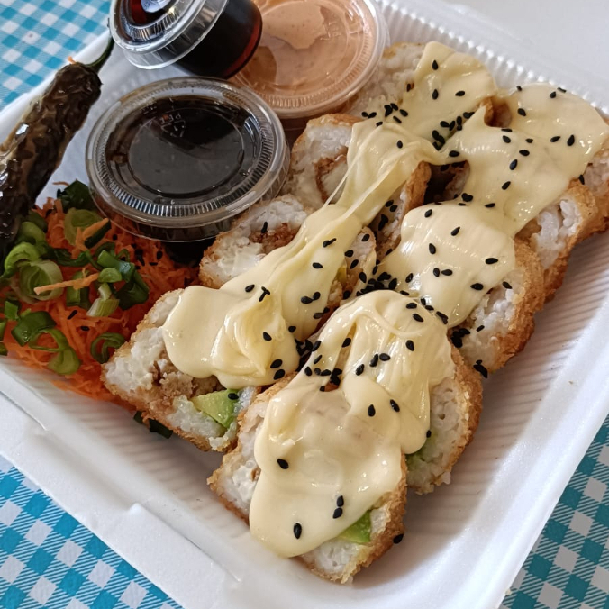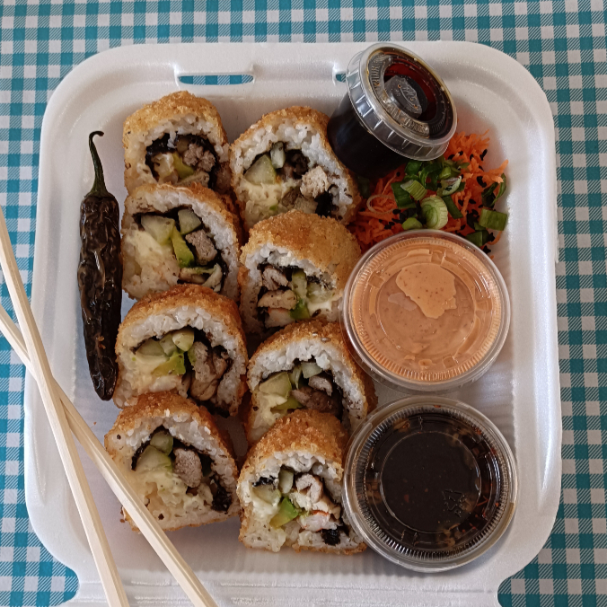 Por dentro surimi, alga, philadelphia, aguacate y pepino. Por fuera empanizado crujiente