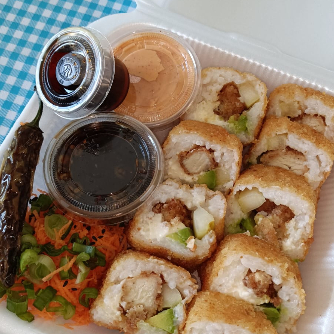 Por dentro pollo, alga, Philadelphia, aguacate y pepino. Por fuera empanizado crujiente