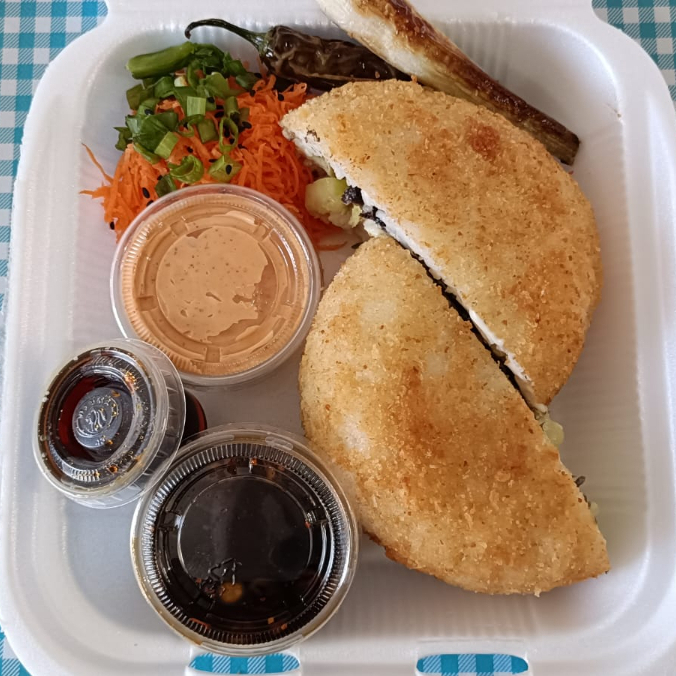 Por dentro carne de res, alga, philadelphia, pepino y aguacate. Por fuera empanizado