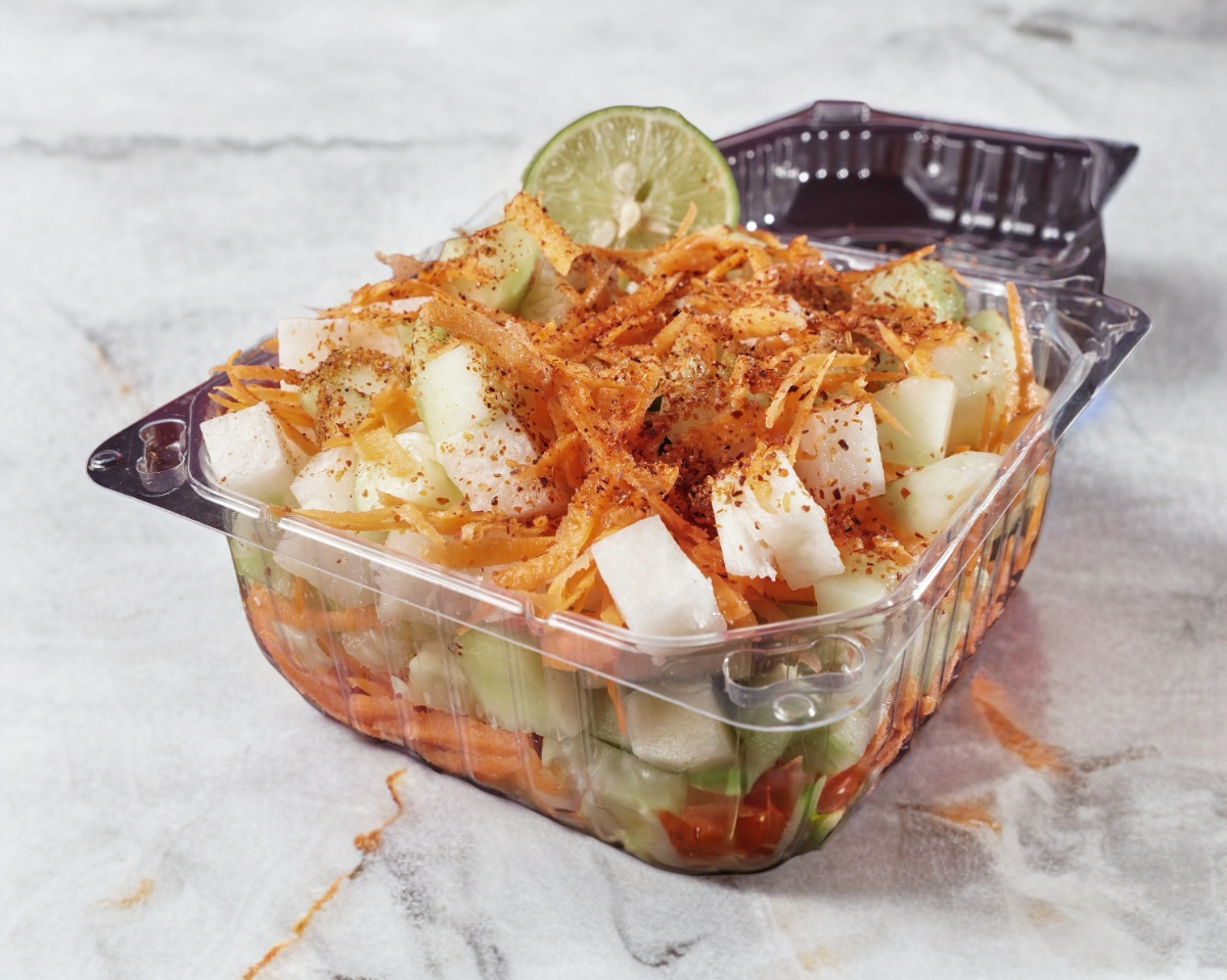 Pepino, zanahoria y jícama con chamoy.