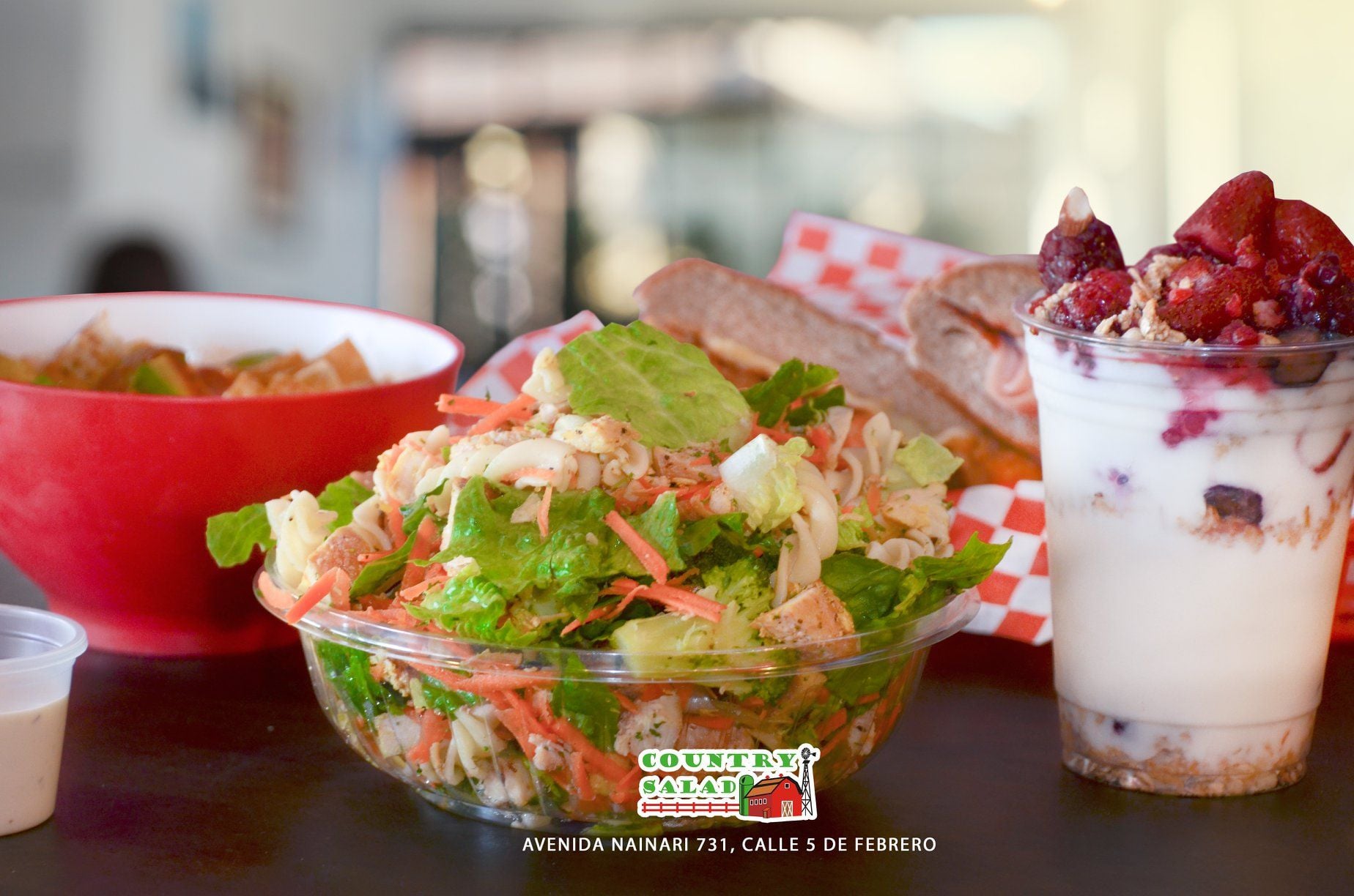 Pita integral, base lechuga, zanahoria, pepino, elote, tomate, aderezo ranch y chipotle.