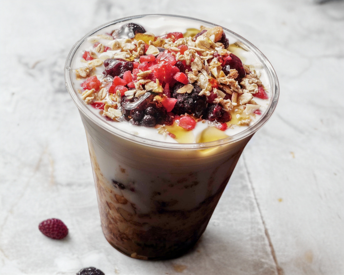 Con durazno, fresas, arándanos, blueberry y frutos rojos.