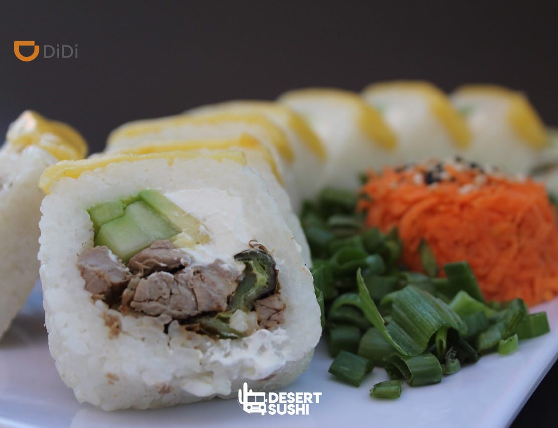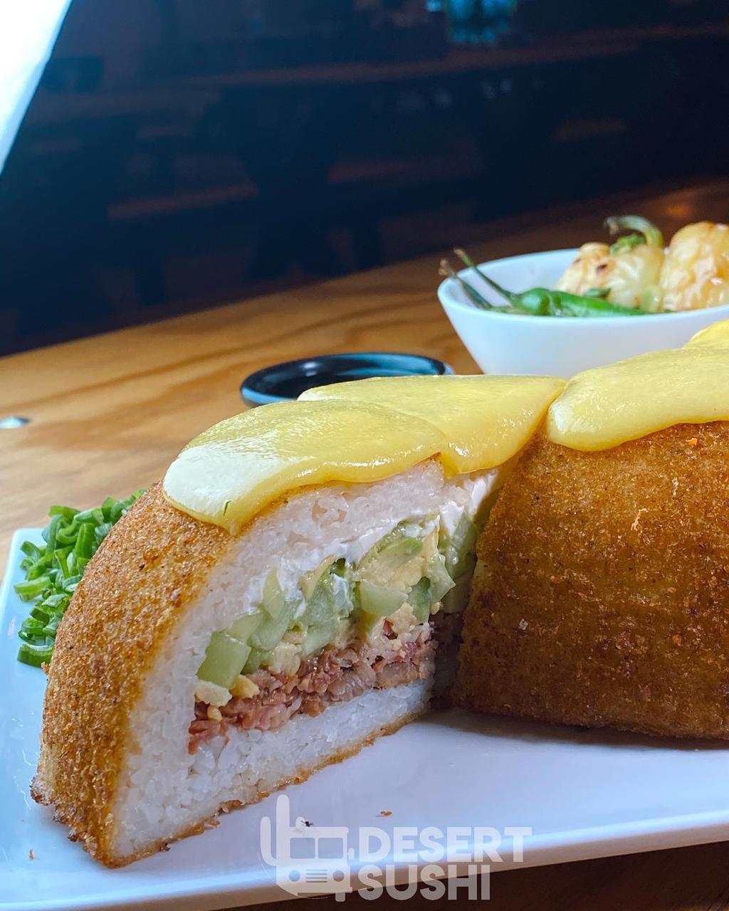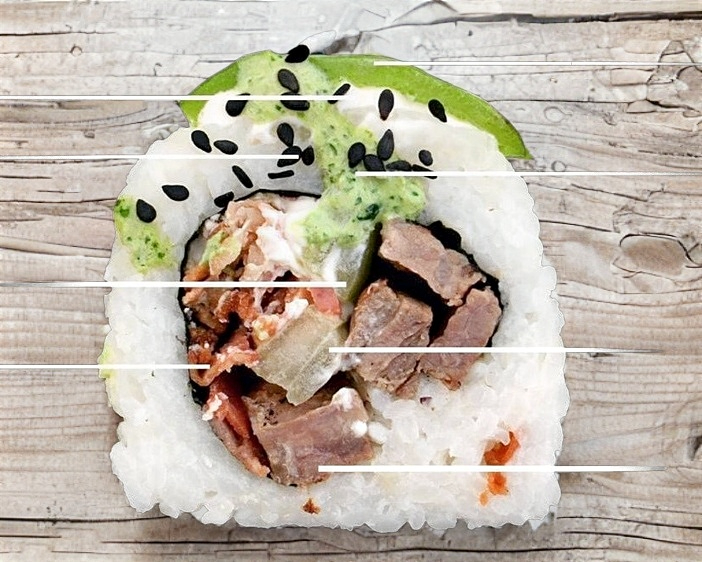 POR DENTRO: PHILA, PEPINO, AGUACATE, CARNE, CHILE SERRANO TOREADO, CUBIERTO DE QUESO GRATINADO.(ROLLO DIVIDIDO EN 10PZ)