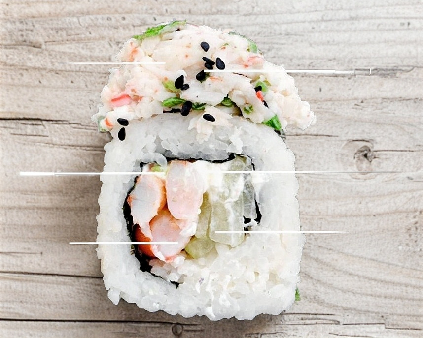 POR DENTRO: PHILA, PEPINO, AGUACATE, CARNE, POLLO, CAMARON,CUBIERTO DE QUESO GRATINADO(ROLLO DIVIDIDO EN 10PZ)