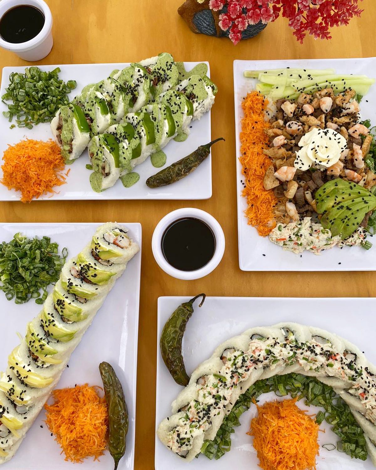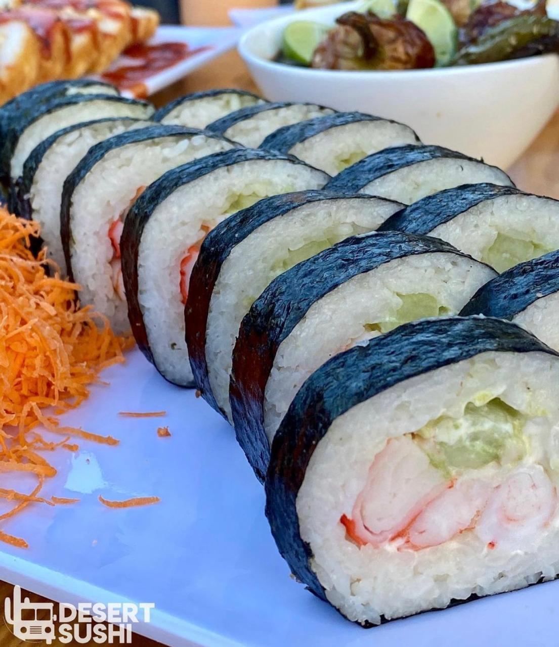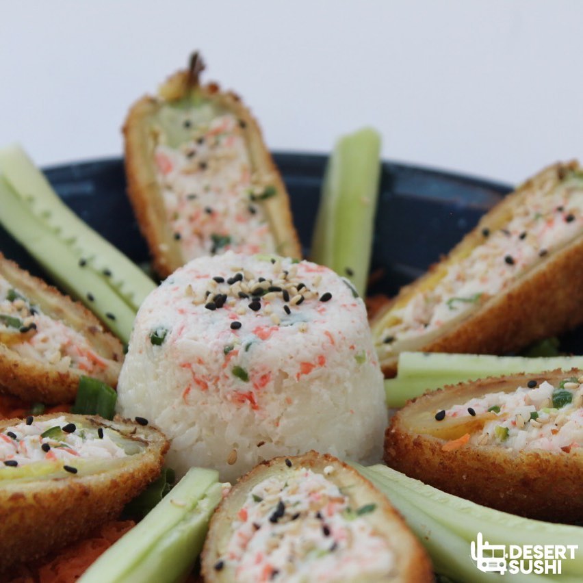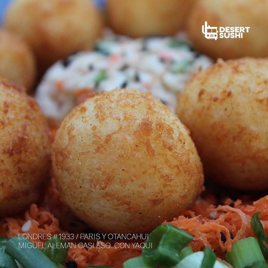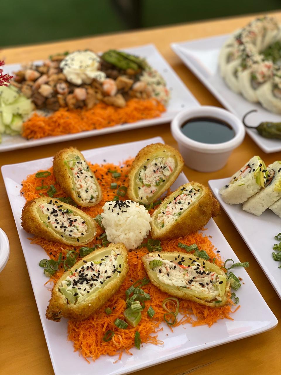 ARROZ EMPANIZADO, PHILADELPHIA, TAMPICO, CARNE, POLLO, CAMARÓN, PEPINO, AGUACATE Y CEBOLLIN.