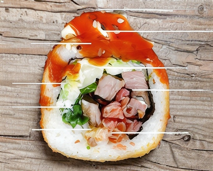 POR DENTRO: PHILA, PEPINO, AGUACATE, CAMARÓN EMPANIZADO, CARNE, TOCINO, CEBOLLIN, CUBIERTO DE QUESO CHIPOTLE.(ROLLO DIVIDIDO EN 10PZ)