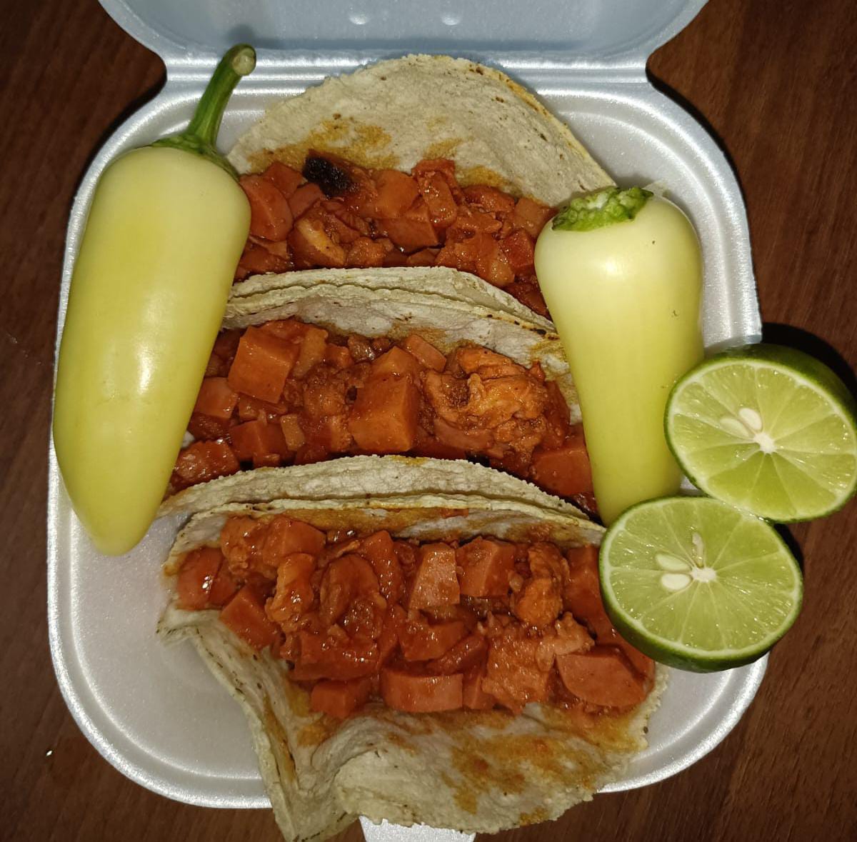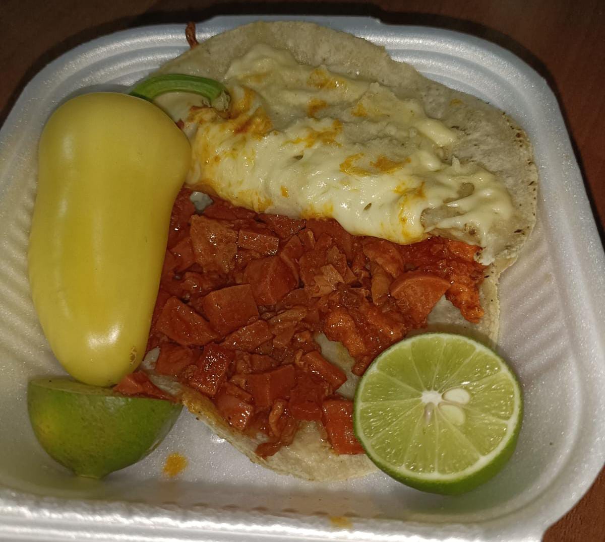 Maíz o harina, con guacamole, salsa verde, pepino, limón y chile caribe.