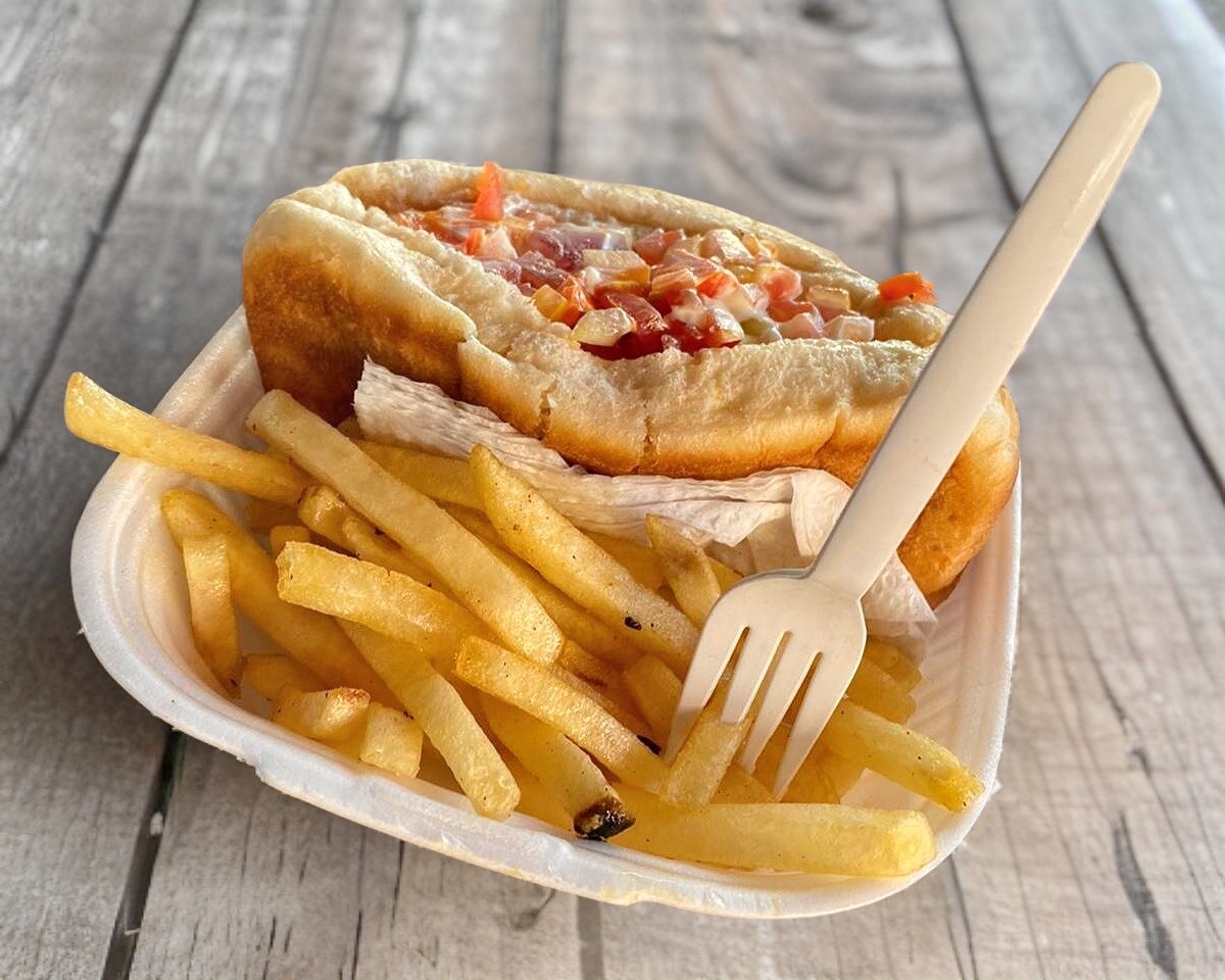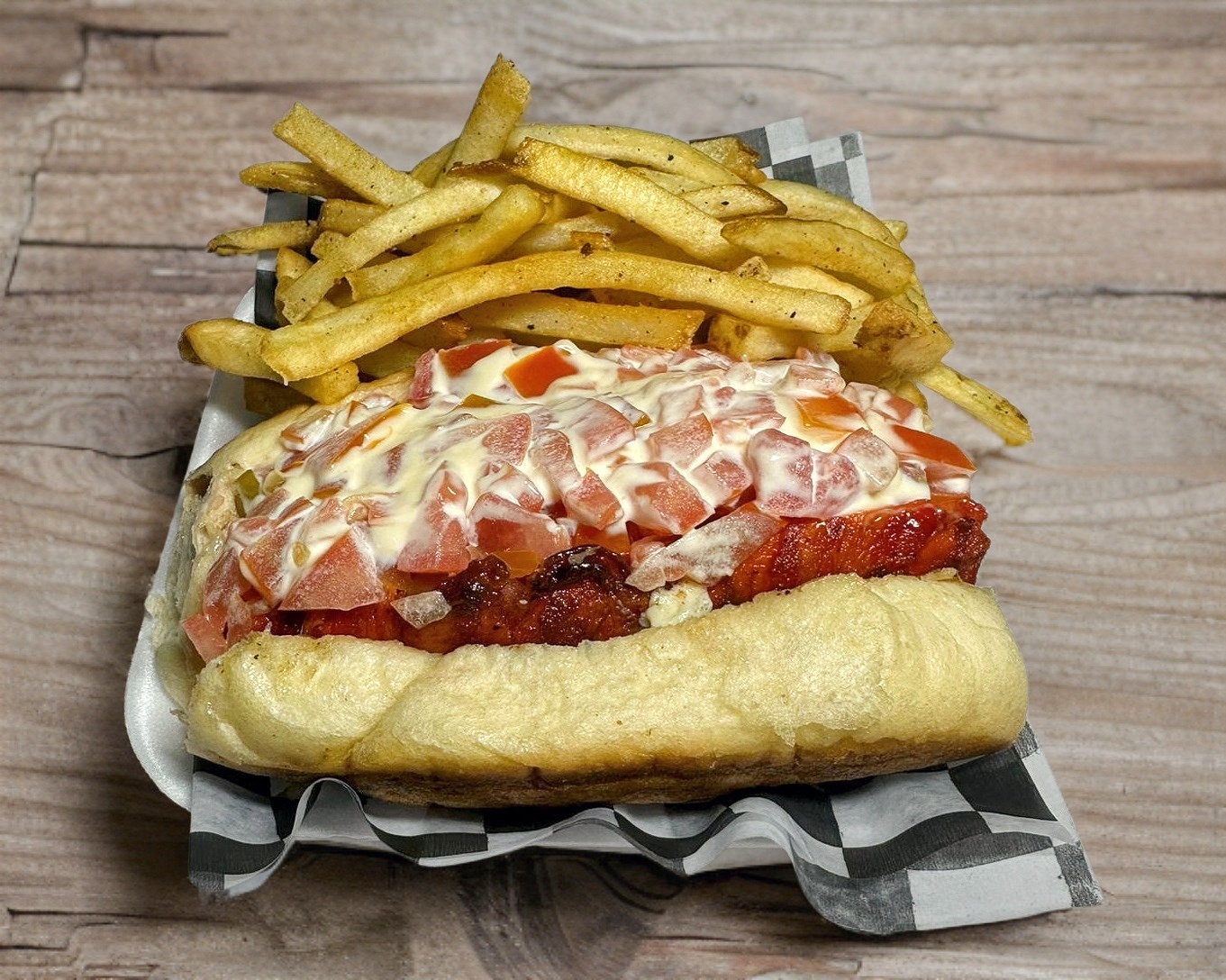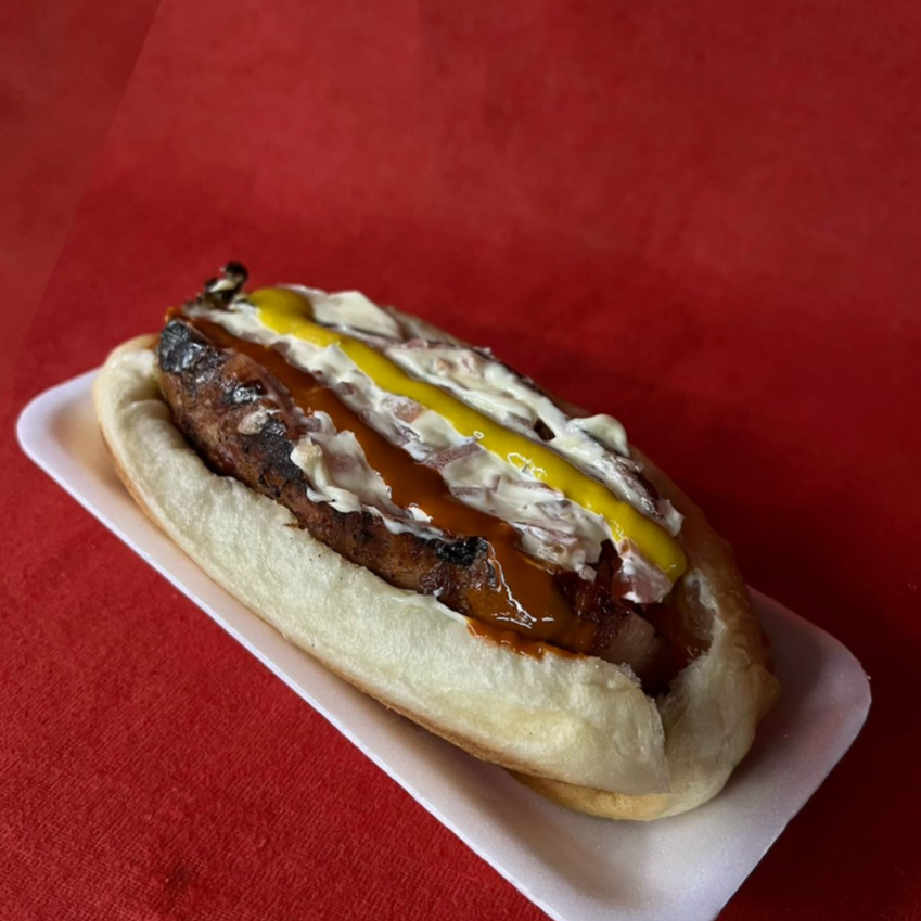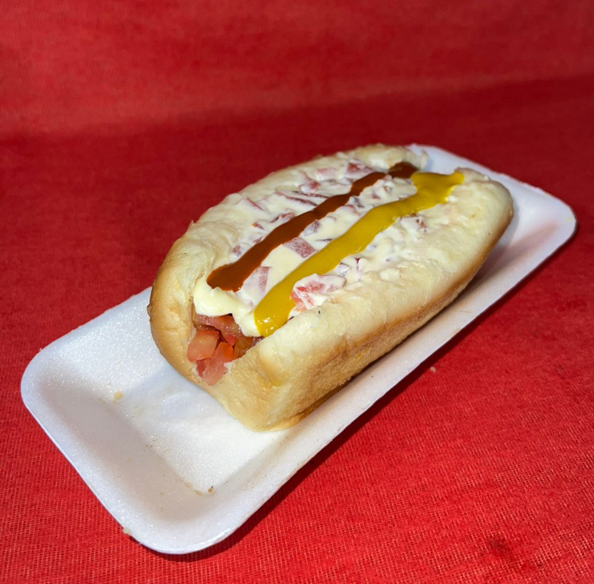 pan, salchicha roja para asar rellena de queso mozarella , salchicha rosarito, queso americano y jamón enrollado en tocino.