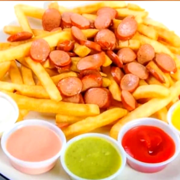 salchicha rosarito, mayonesa, cebolla asada o cruda, tomate, salsa, mostaza, acompañado de papas