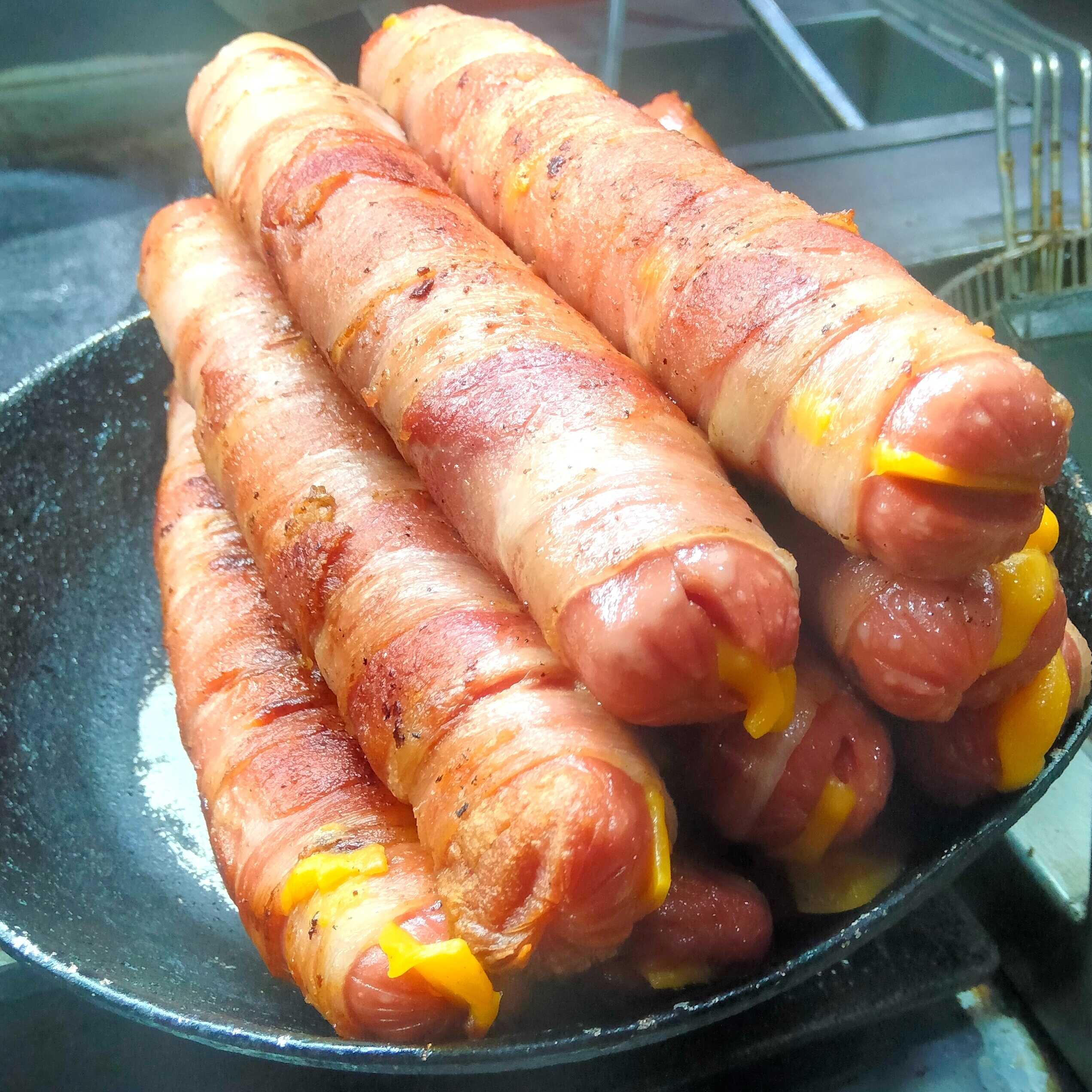 pan jumbo, salchicha campestre y rosarito, tomate cebolla asada o cruda, mayonesa, mostaza, wichol.