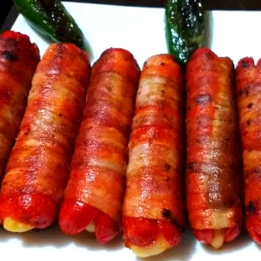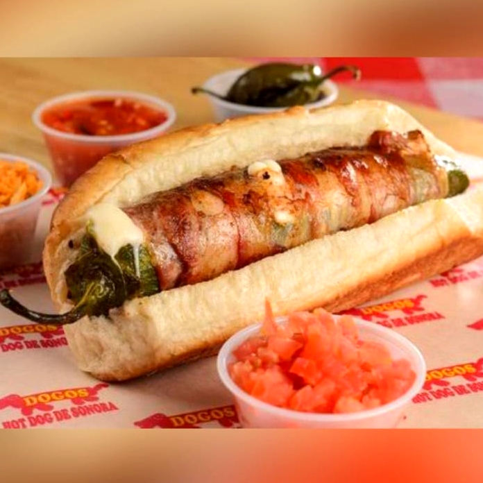 chile verde, queso mozarella, salchicha rosarito, jamon, tocino, pan jumbo, mayonesa, mostaza, wichol, tomate, cebolla asadao cruda.