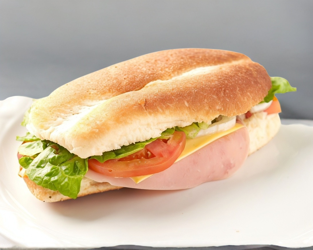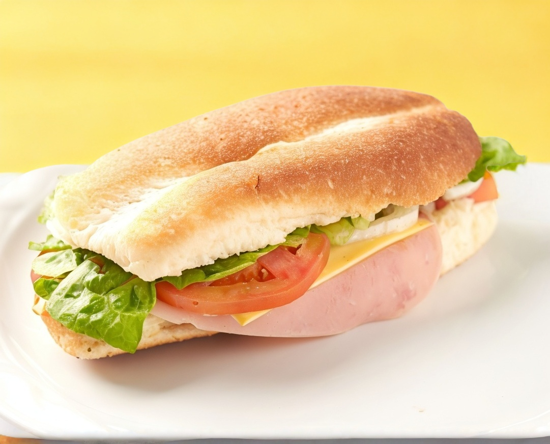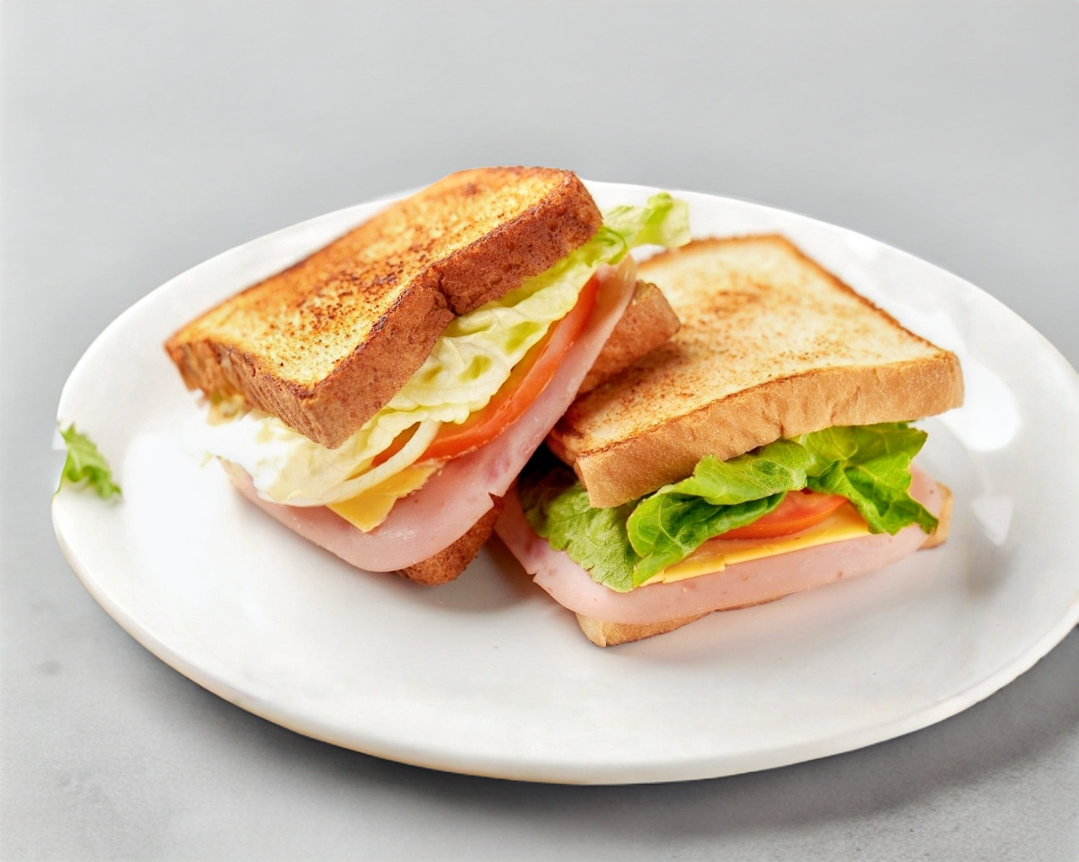 Sandwich pan integral o blanco (favor de especificar) con jamón y queso amarillo americano, lechuga, tomate, cebolla y chiles jalapeños.