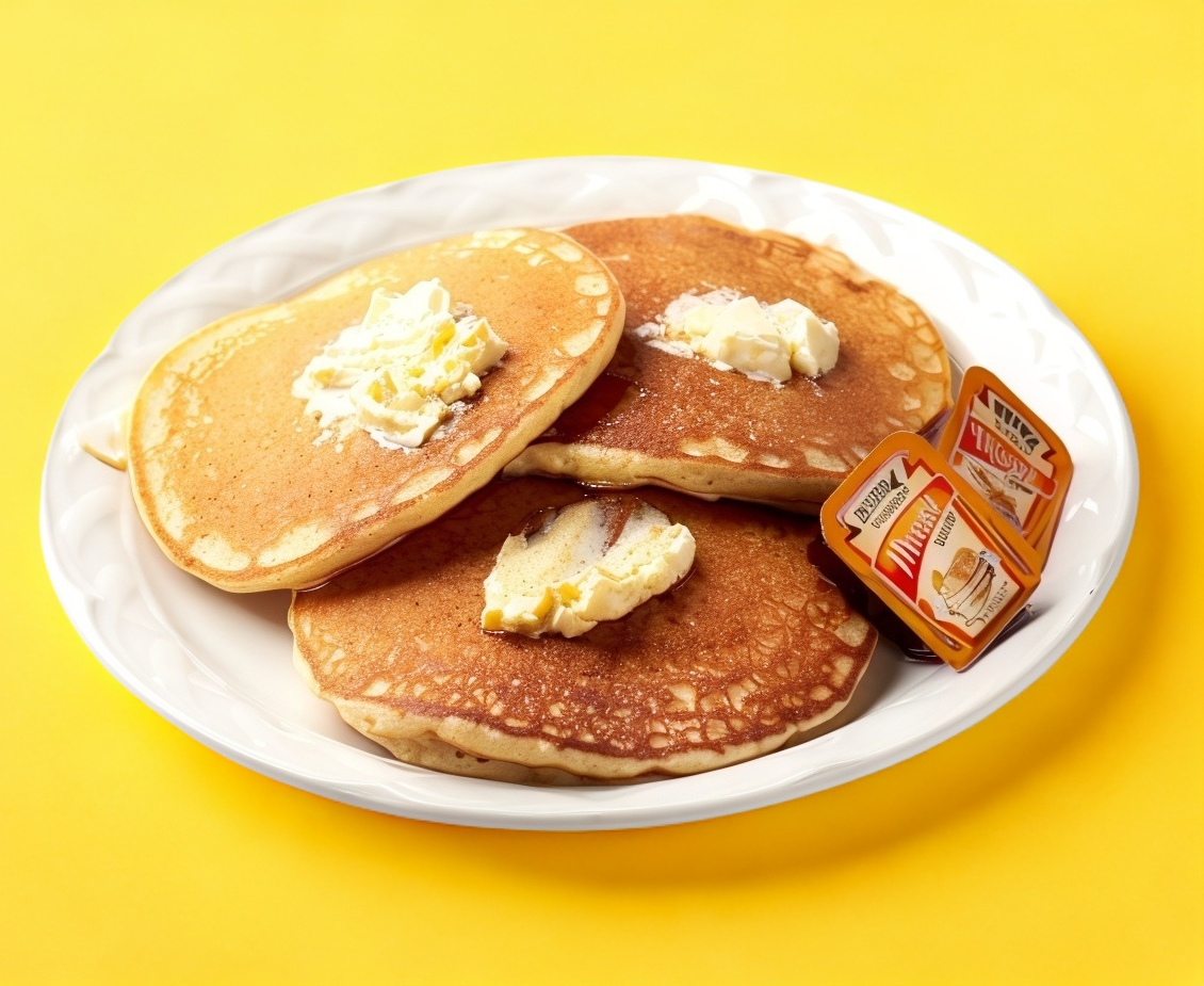 Hot cakes pieza, acompañado de mantequilla y miel de maple