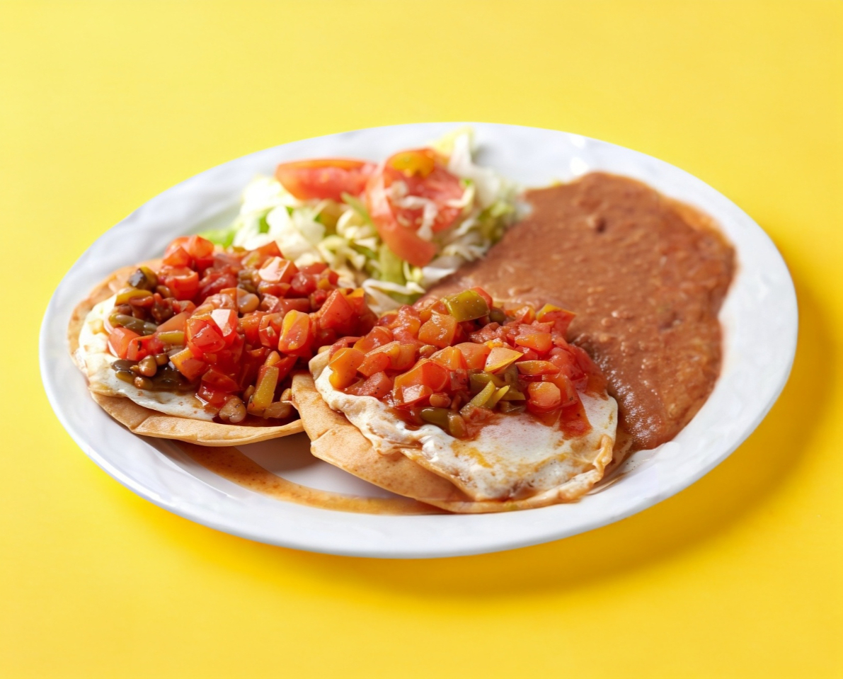 2 huevos rancheros en su tostada con salsa de la casa, acompañado de frijol y ensalada.