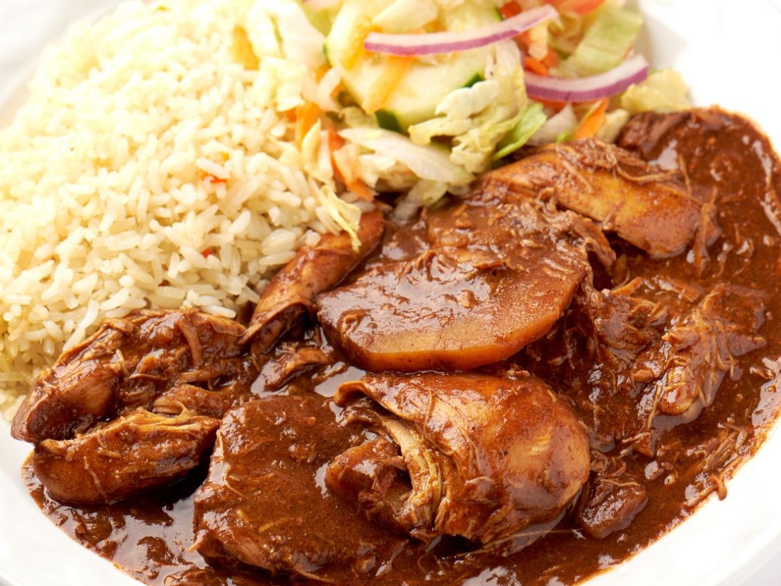 Chilaquiles, totopos de maíz en salsa roja, con media crema, queso fresco, cebolla morada acompañado de frijol y ensalada.