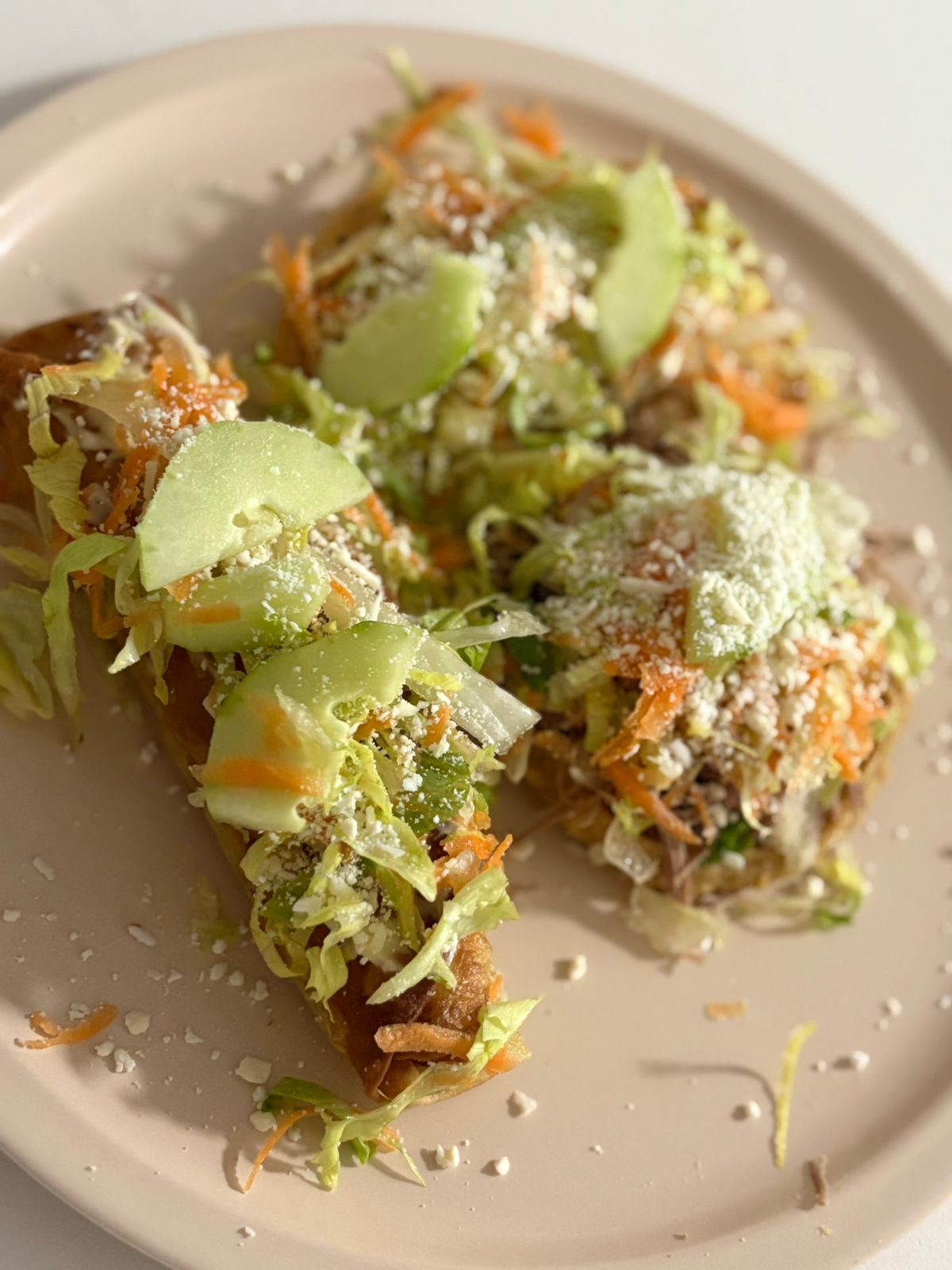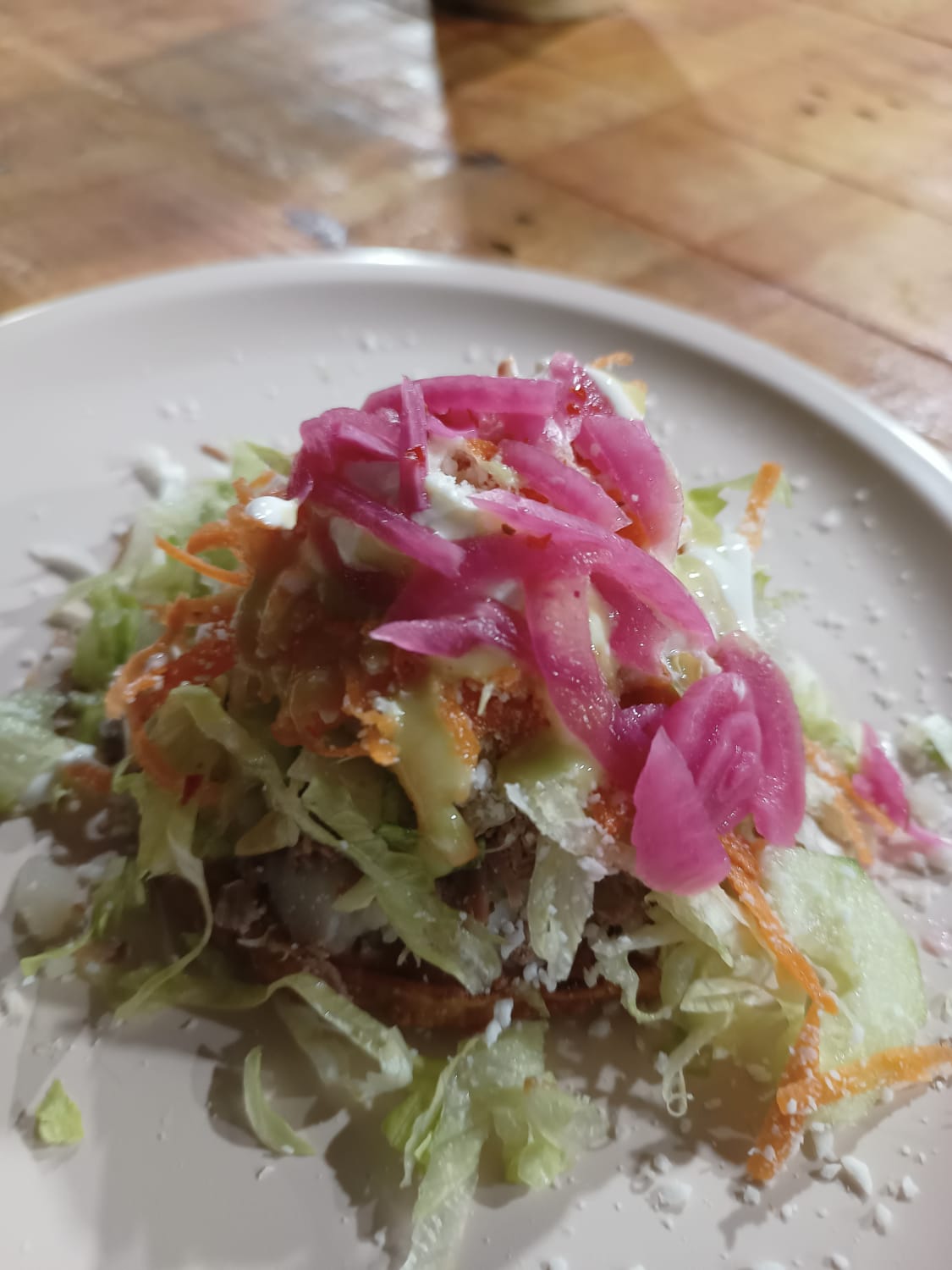 Tostada de maíz freida una pieza Cama de frijol , papa , carne , lechuga , zanahoria , pepino , quedó en polvo , opciónnal crema y cebolla morada