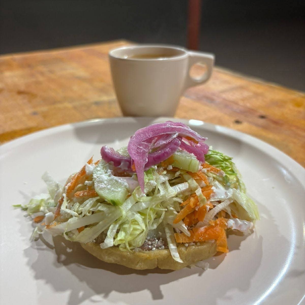Gordita de maíz una pieza Cama de frijol, papa , carne , lechuga , zanahoria, pepino queso en polvo , opcional crema y cebolla morada
