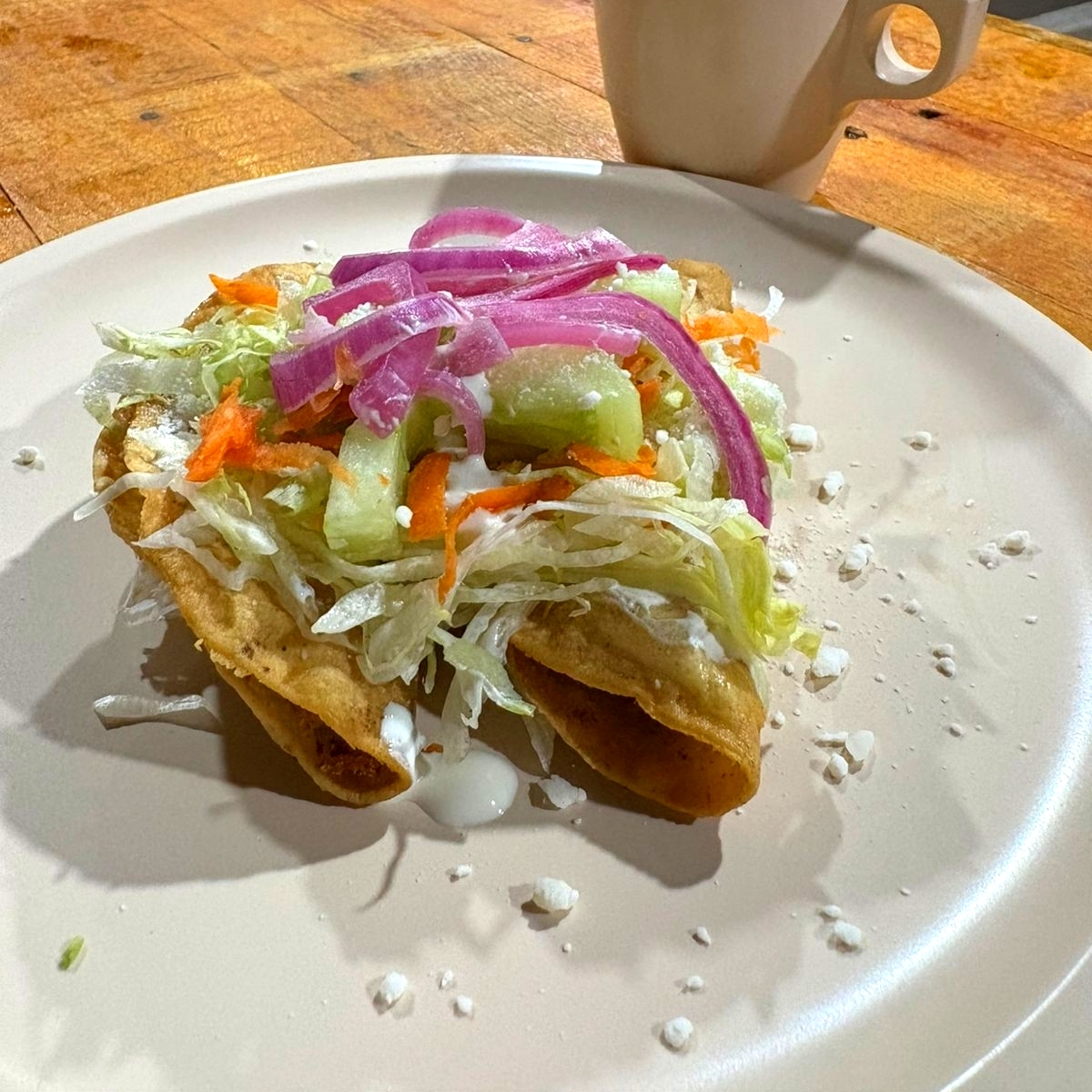 Tacos Dorados 2 piezas Carne opcion con papa, lechuga, zanahoria, pepino , queso en polvo , opcional crema y cebolla morada