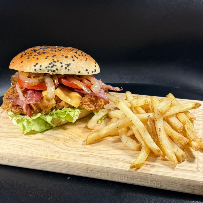 Crujiente pechuga de pollo, queso americano, tocino, lechuga, tomate y cebolla morada