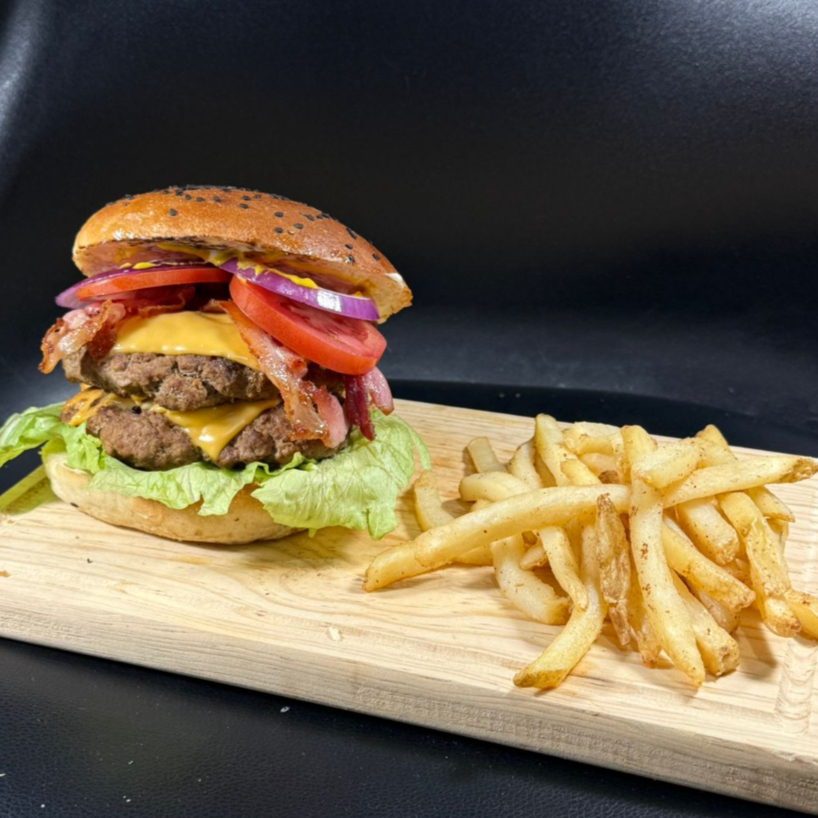 Dos carnes de 200gr, con doble queso americano, lechuga, tomate y cebolla morada