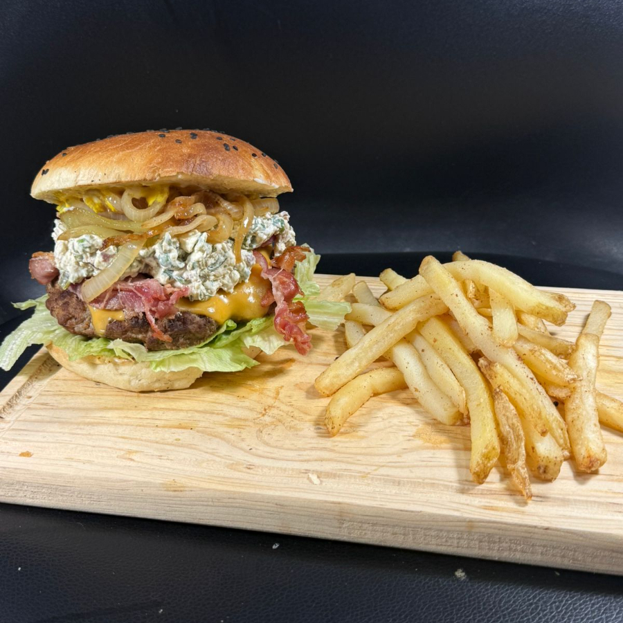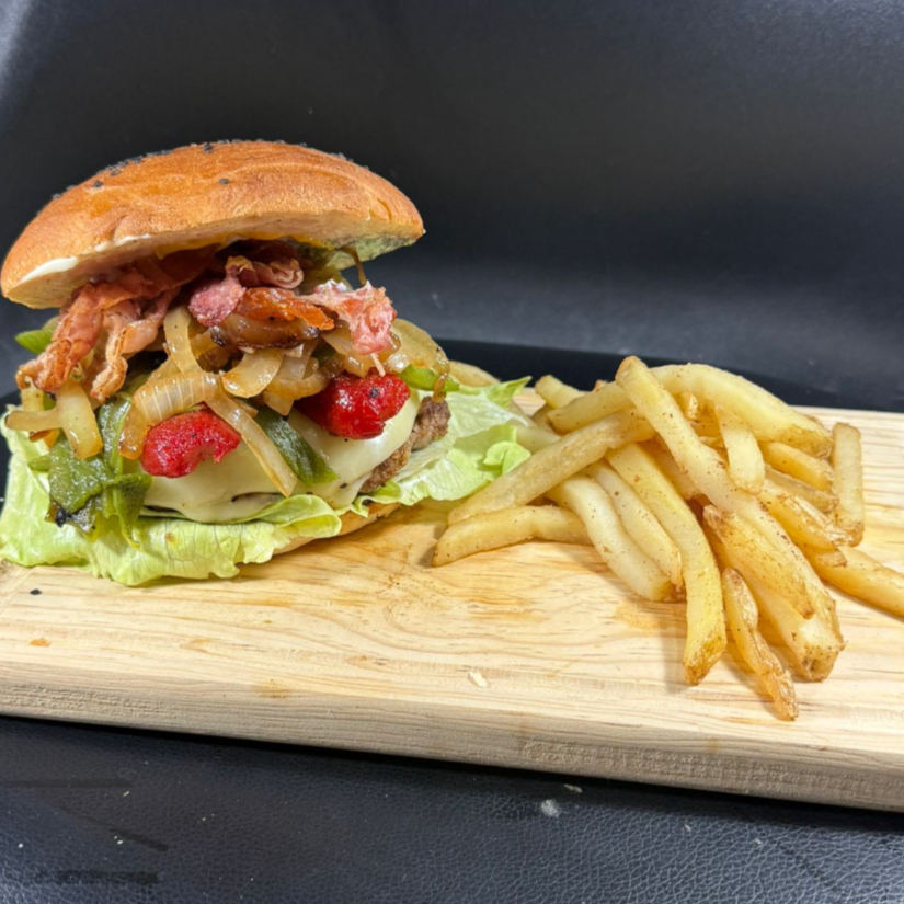 200gr de carne de res, queso americano, cebolla asada, lechuga, tocino, queso gratinado, chile verde tatemado, salchicha para asar y salsa BBQ