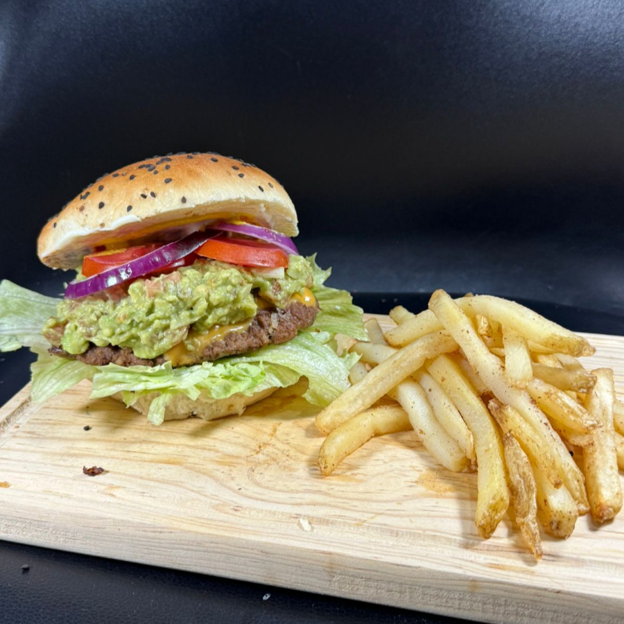 200gr de carne de res, queso americano, lechuga, tomate, cebolla morada y guacamole