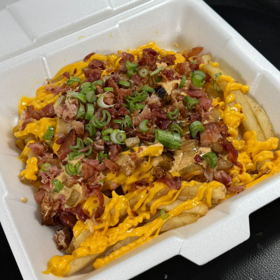 300gr de papas fritas, aderezo de queso, tocino, cebolla caramelizada y aderezo especial de la casa