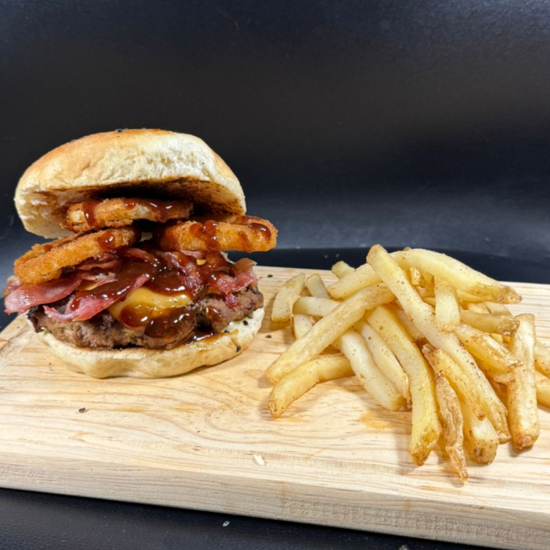 200gr de carne de res, tocino, queso americano, aros de cebolla y salsa BBQ
