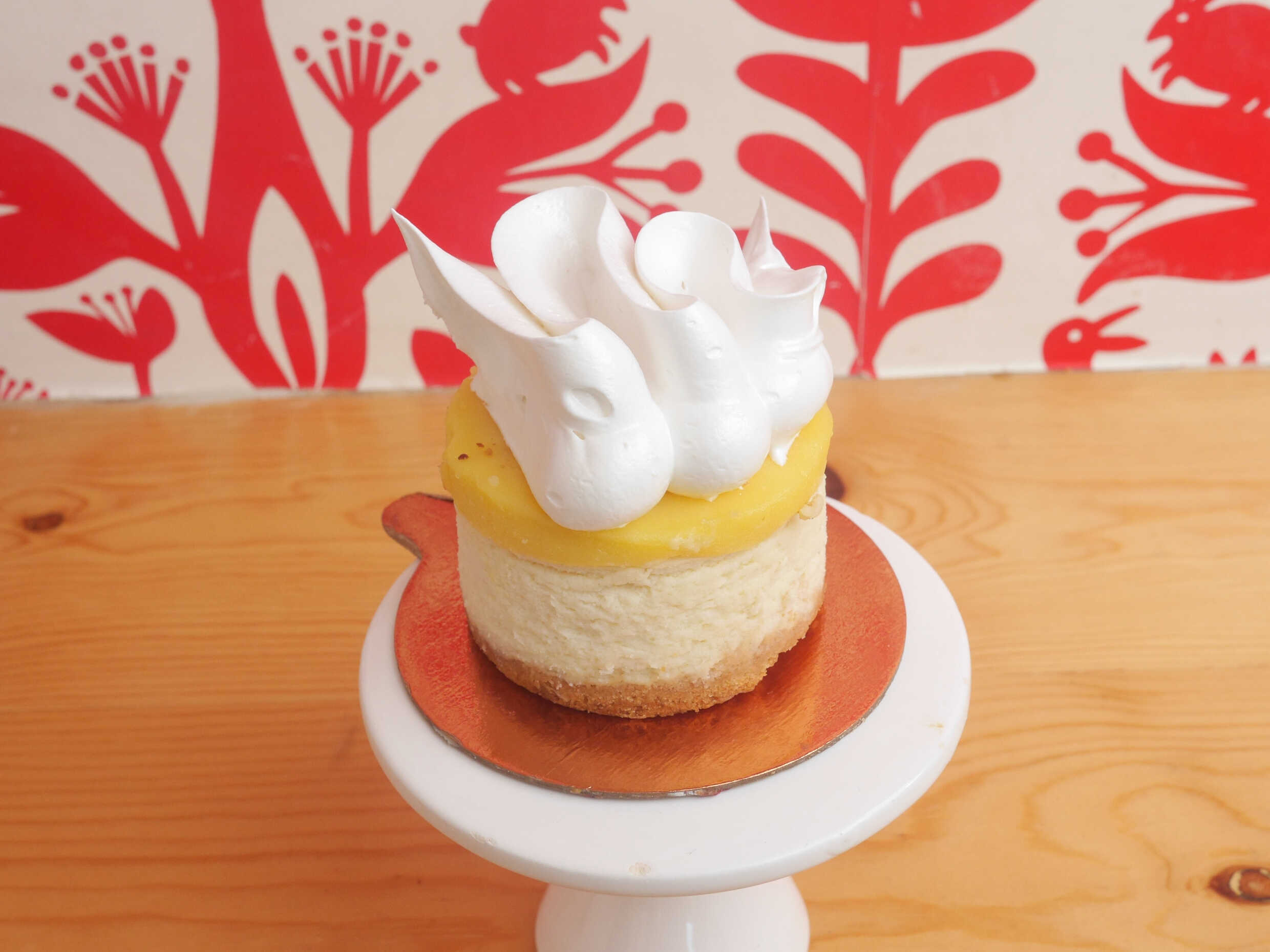 Pastelito de vainilla, relleno cheesecake, dulce de leche y betún de vainilla.