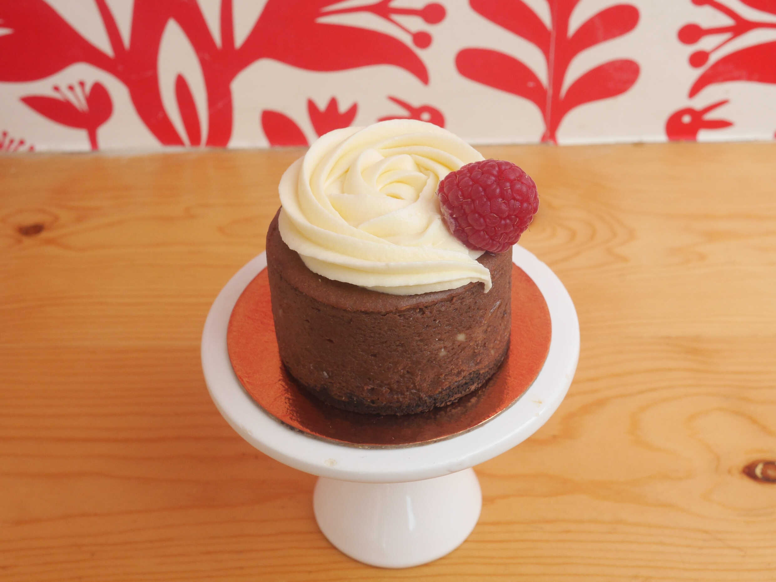 Cheesecake sabor chocolate blanco y semi amargo con betún de chocolate.