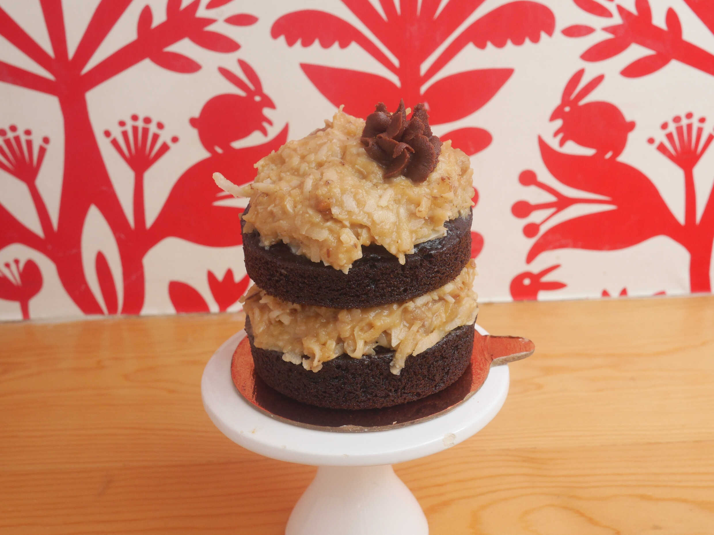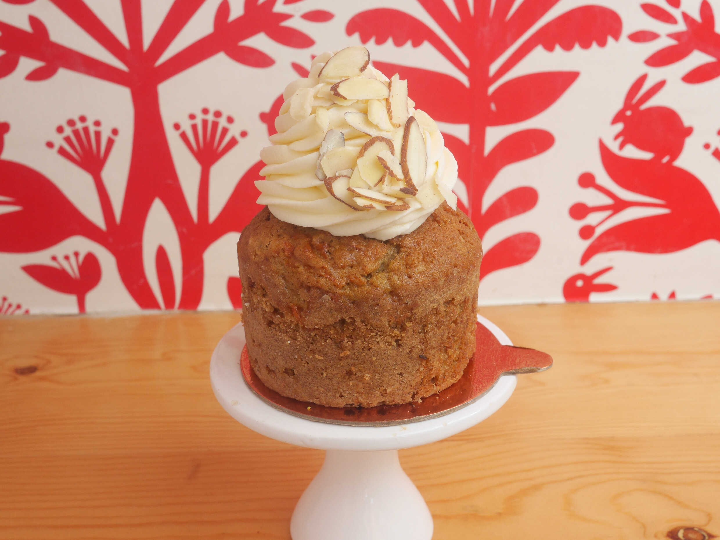Pastelito de zanahoria, betún queso crema y almendra relleno de cheesecake.