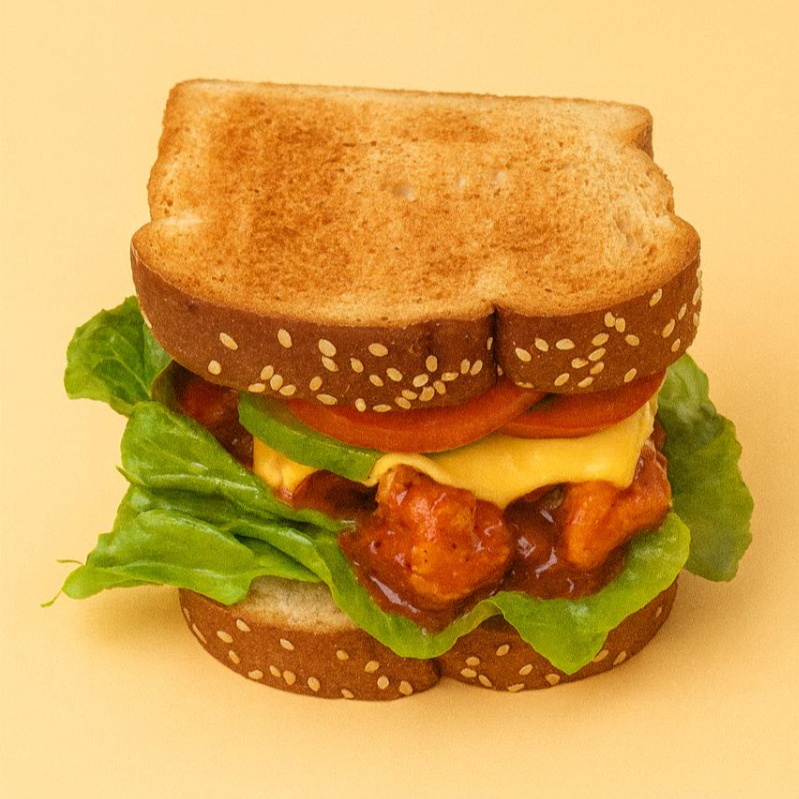 Pan integral dorado, mayonesa, lechuga, pollo bañado en salsa búfalo, tomate, aguacate , queso americano.