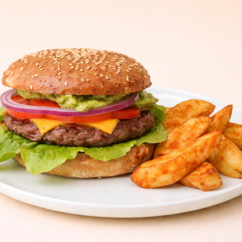 Pan integral, carne de res, queso chihuahua, salsa BBQ, mayonesa, mantequilla, lechuga, tomate, aguacate, cebolla morada, acompañado de papas sazonadas, aderezo ranch y catsup.