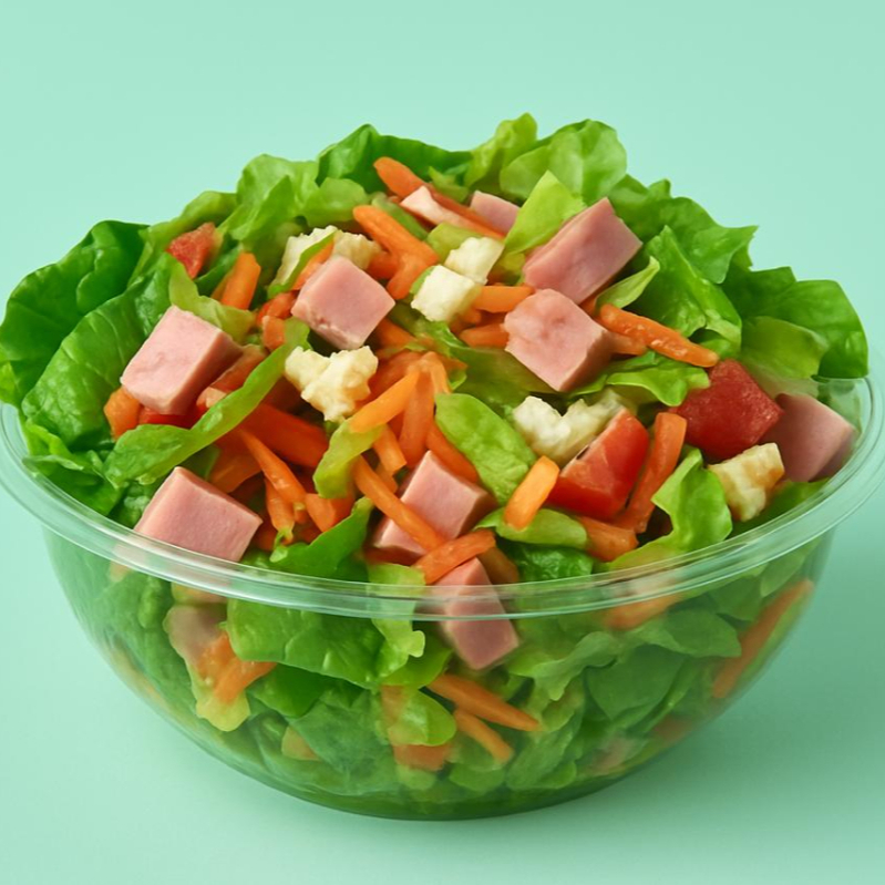 Cama de lechuga, jamón, queso panela, pepino, tomate, aguacate, zanahoria, crouton o fritura, 1 aderezo de tu preferencia.