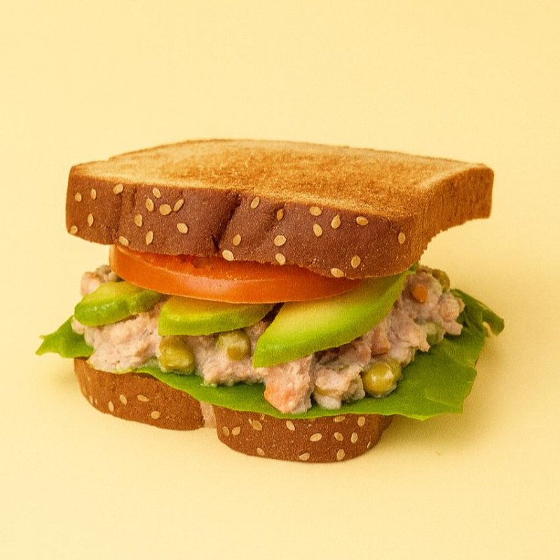 Pan integral dorado , mayonesa, lechuga, ensalada de atún ,tomate, aguacate.