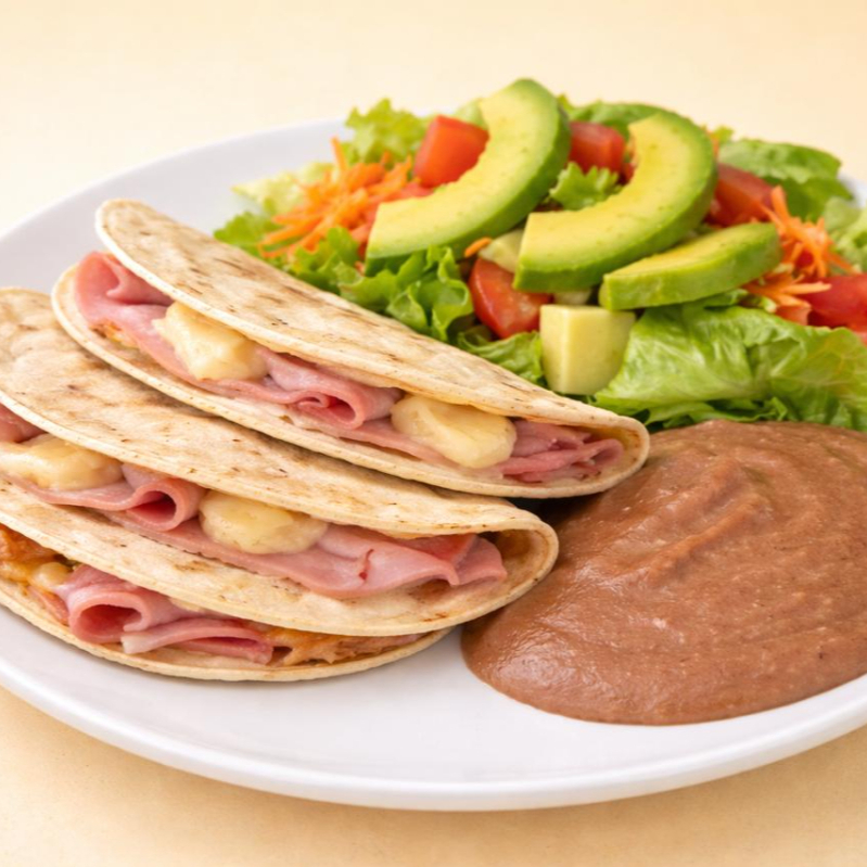 Se acompañan de ensalada fresca, aguacate, frijol y salsa de la casa. Harina (2), maíz (3).