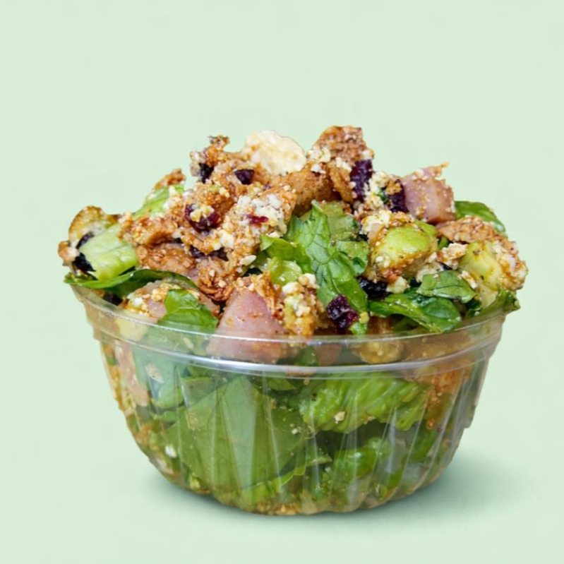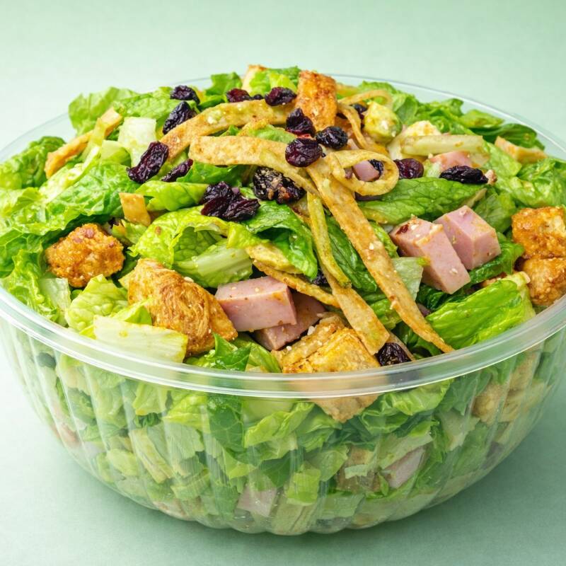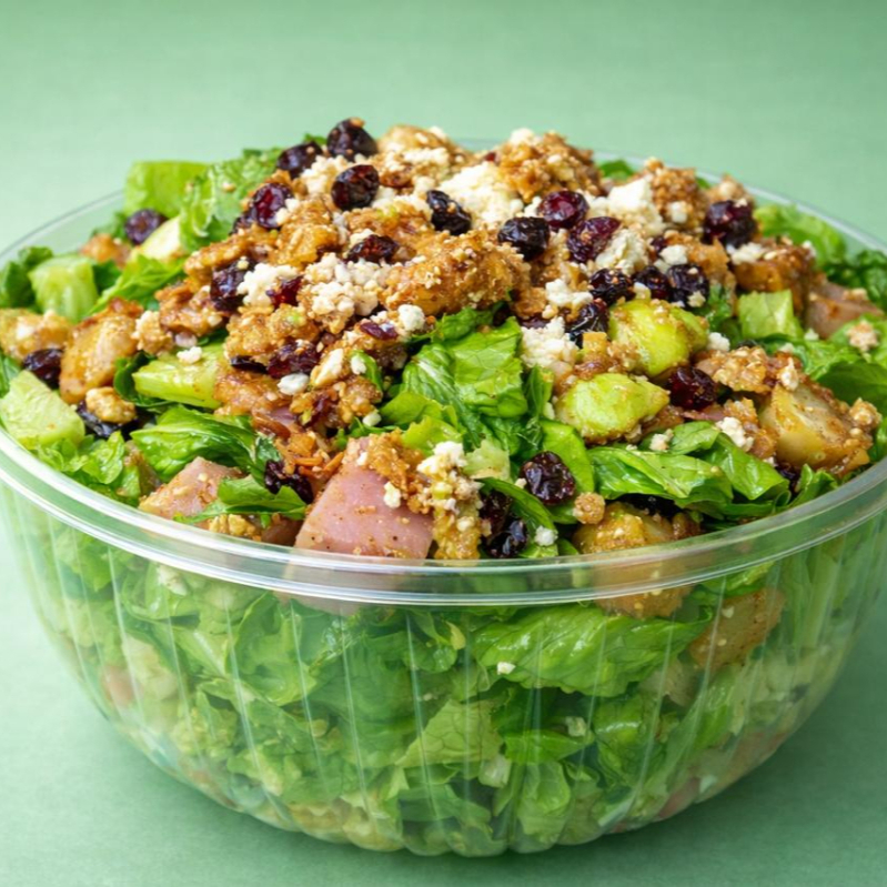 Cama de lechuga, 2 porciones de pollo a escoger, jamón, panela, aguacate, arándano, croutón o fritura, 1 aderezo de tu preferencia.
