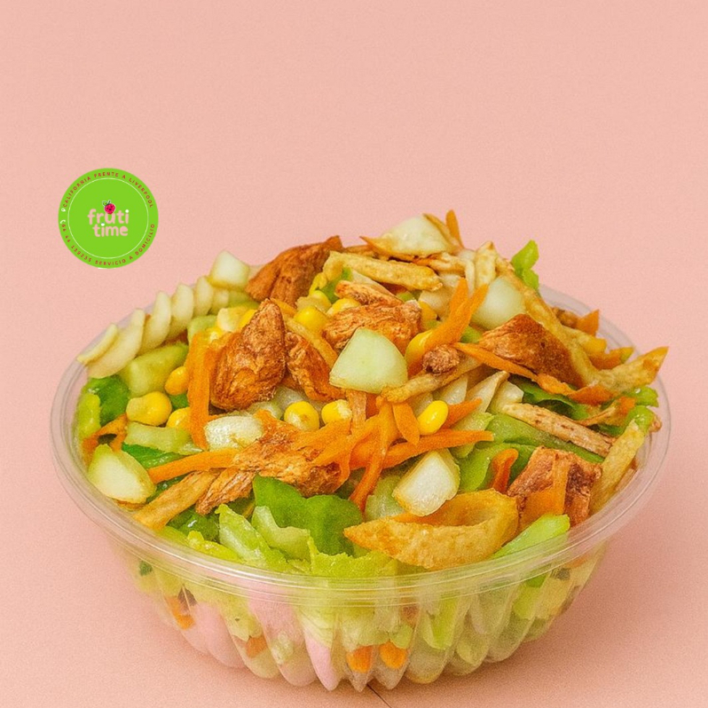 Cama de lechuga, 1 Porción de Pollo a escoger, Pepino, Pasta, Zanahoria, Elote, Fritura, 1 Aderezo a escoger.