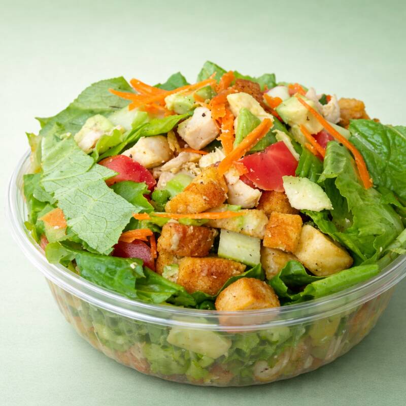 Cama de lechuga, 1 porción de pollo a escoger, pepino, tomate, aguacate, zanahoria, crouton o fritura, 1 aderezo de tu preferencia.