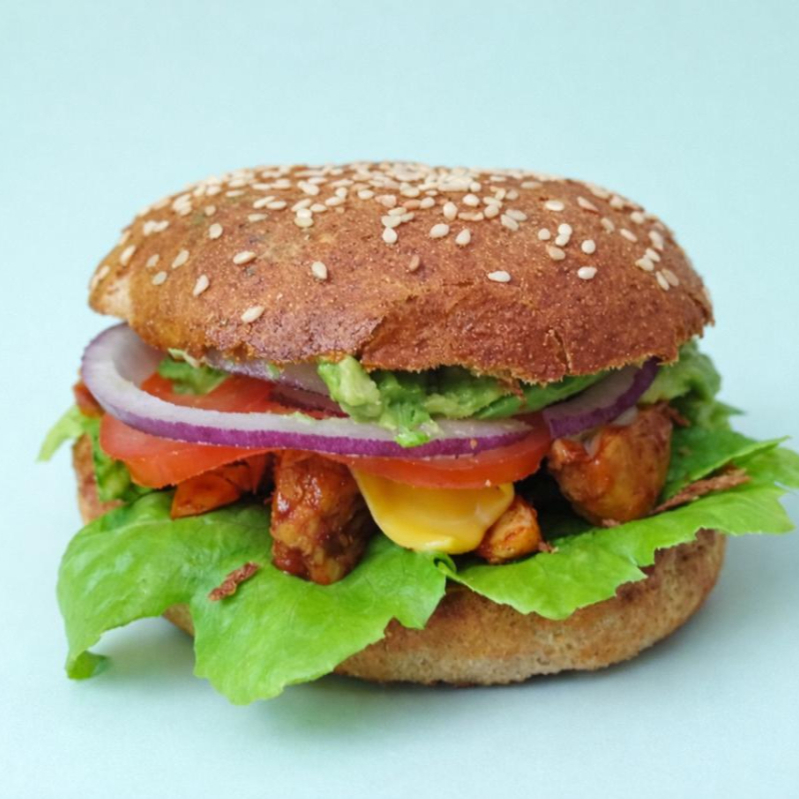 Pan integral, pollo lemon pepper, queso manchego, lechuga, tomate, aguacate, cebolla morada , salsa BBQ, mayonesa.