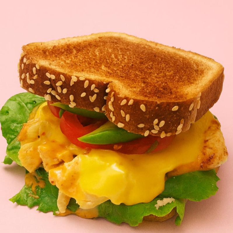 Pan integral dorado, mayonesa, lechuga, pollo sazonado con Lemmon Pepper, aderezo chipotle de la casa, tomate, aguacate , queso americano derretido.