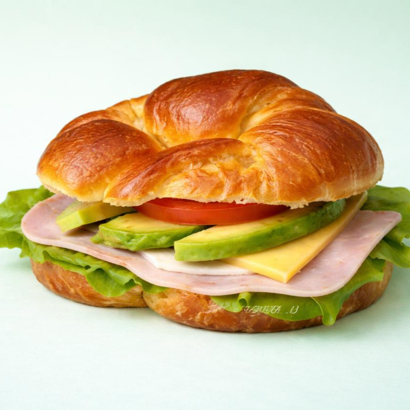Pan de cuernito , mayonesa, lechuga, jamón, queso, tomate, aguacate.