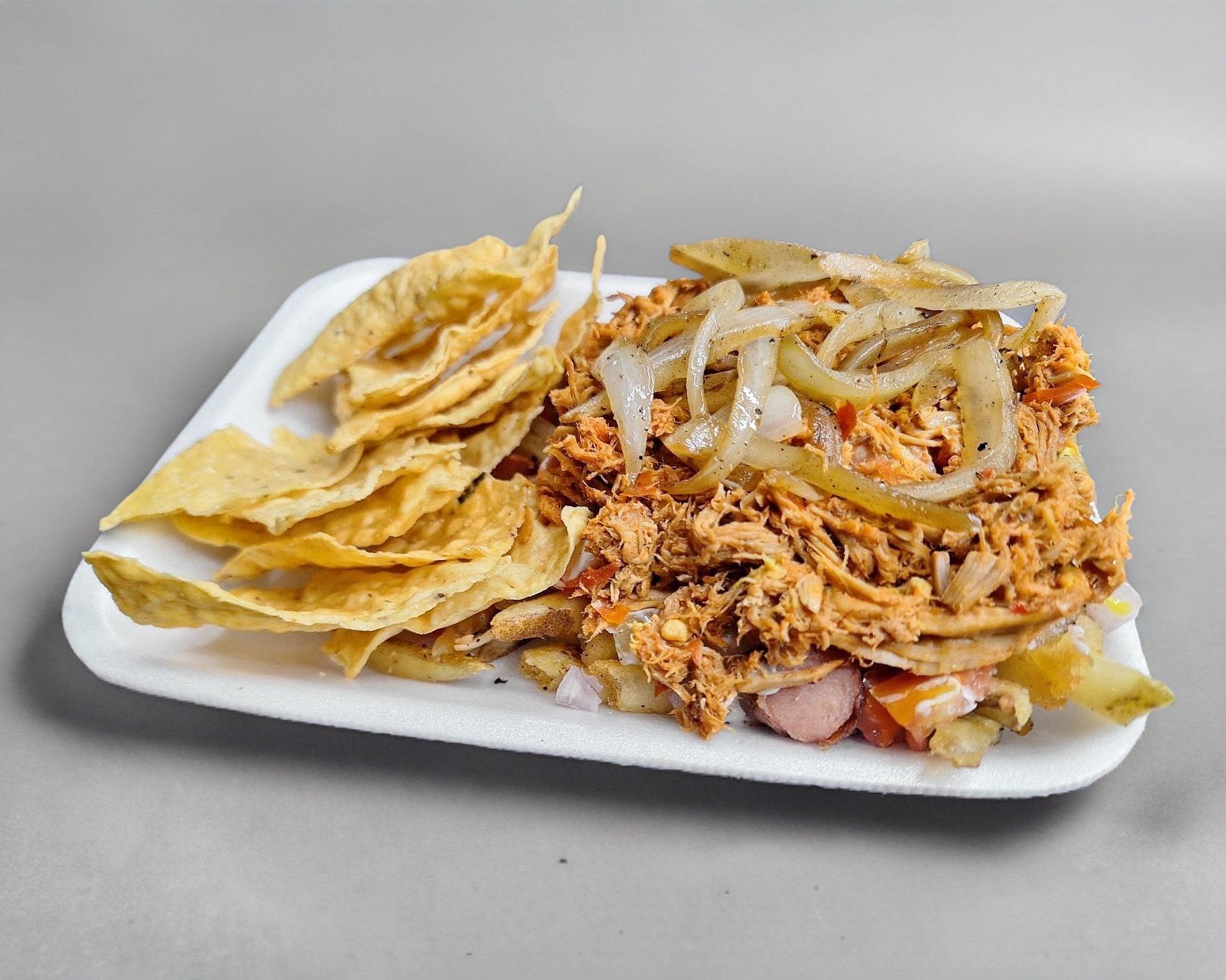 Papas fritas con 3 salchichas rosarito picadas con tomate, cebolla cruda o asada mayonesa, mostaza y salsa huichol cubierta con deliciosa carne de pierna de puerco acompañada de totopos.