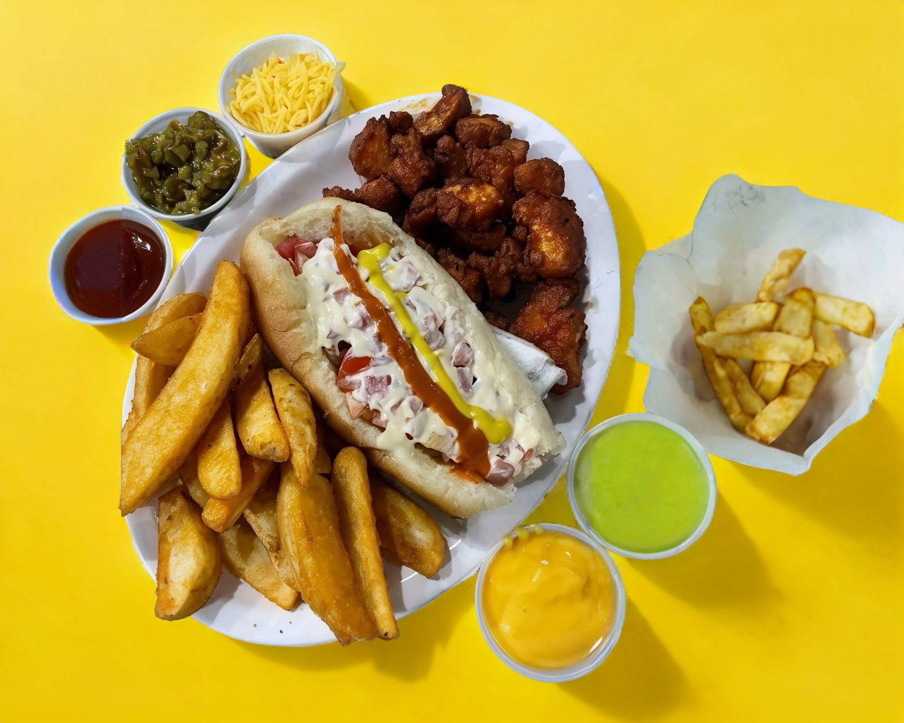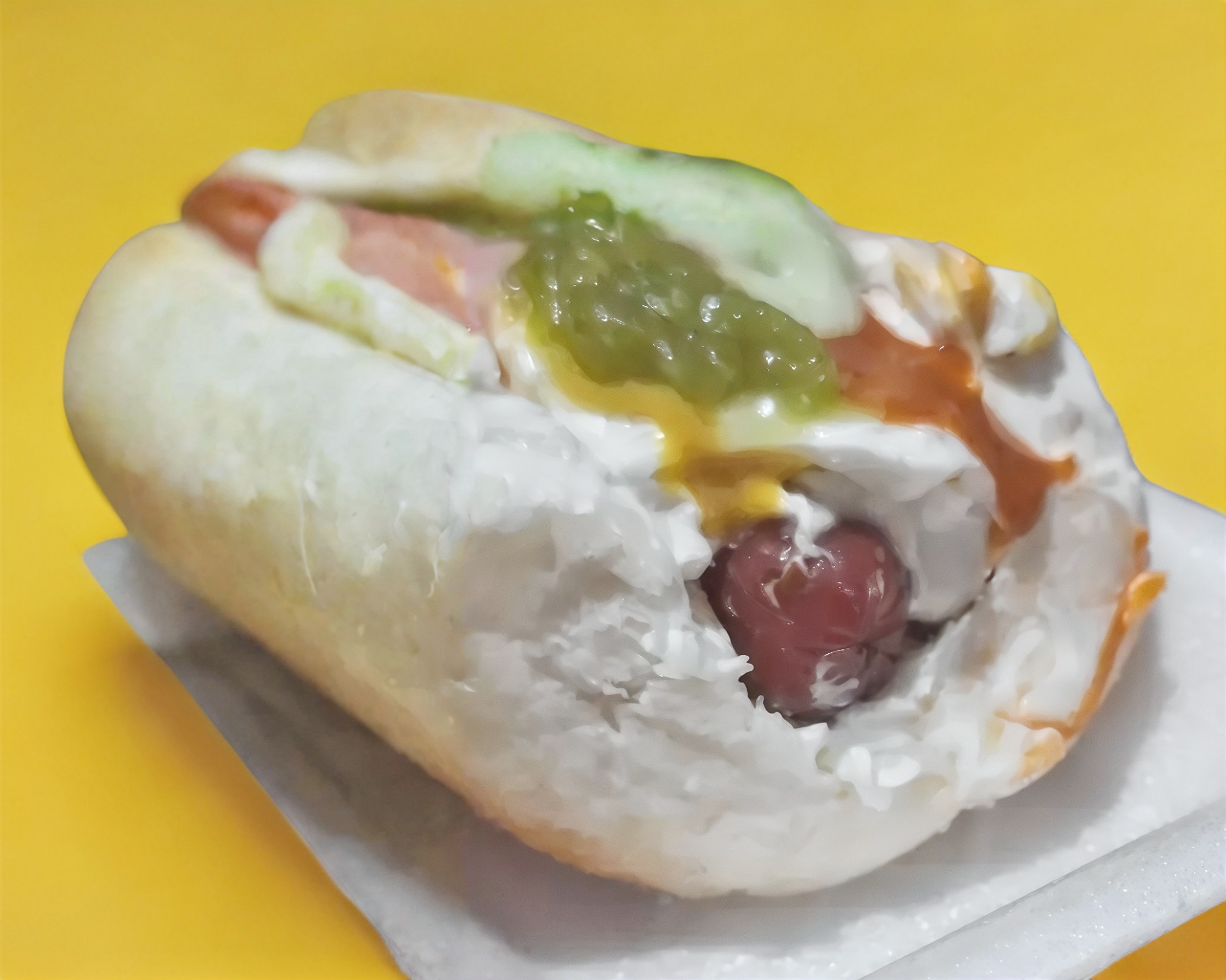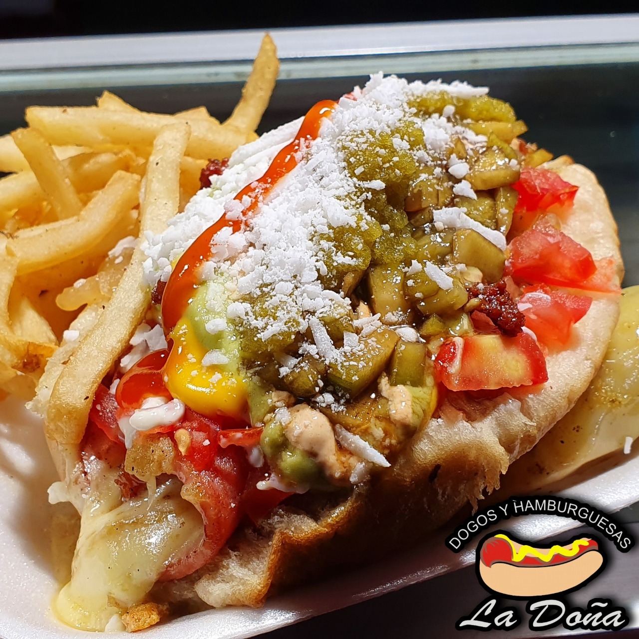 Hot dog en pan jumbo con chile verde preparado con wini rosarito y queso chihuahua, jamón y tocino, tomate, cebolla asada o cruda, mayonesa, huichol, mostaza, incluye papas.