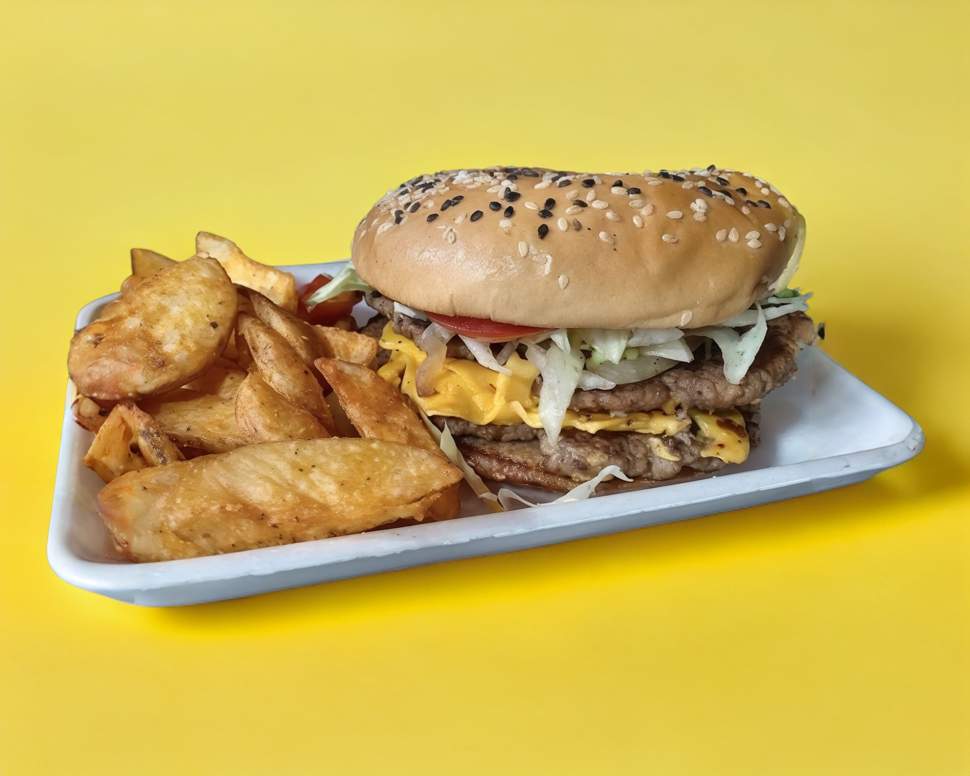 pan con ajonjoli doble carne de res , queso chedar, lecguha tomate y cebolla incluye papas a la francesa o sazonada